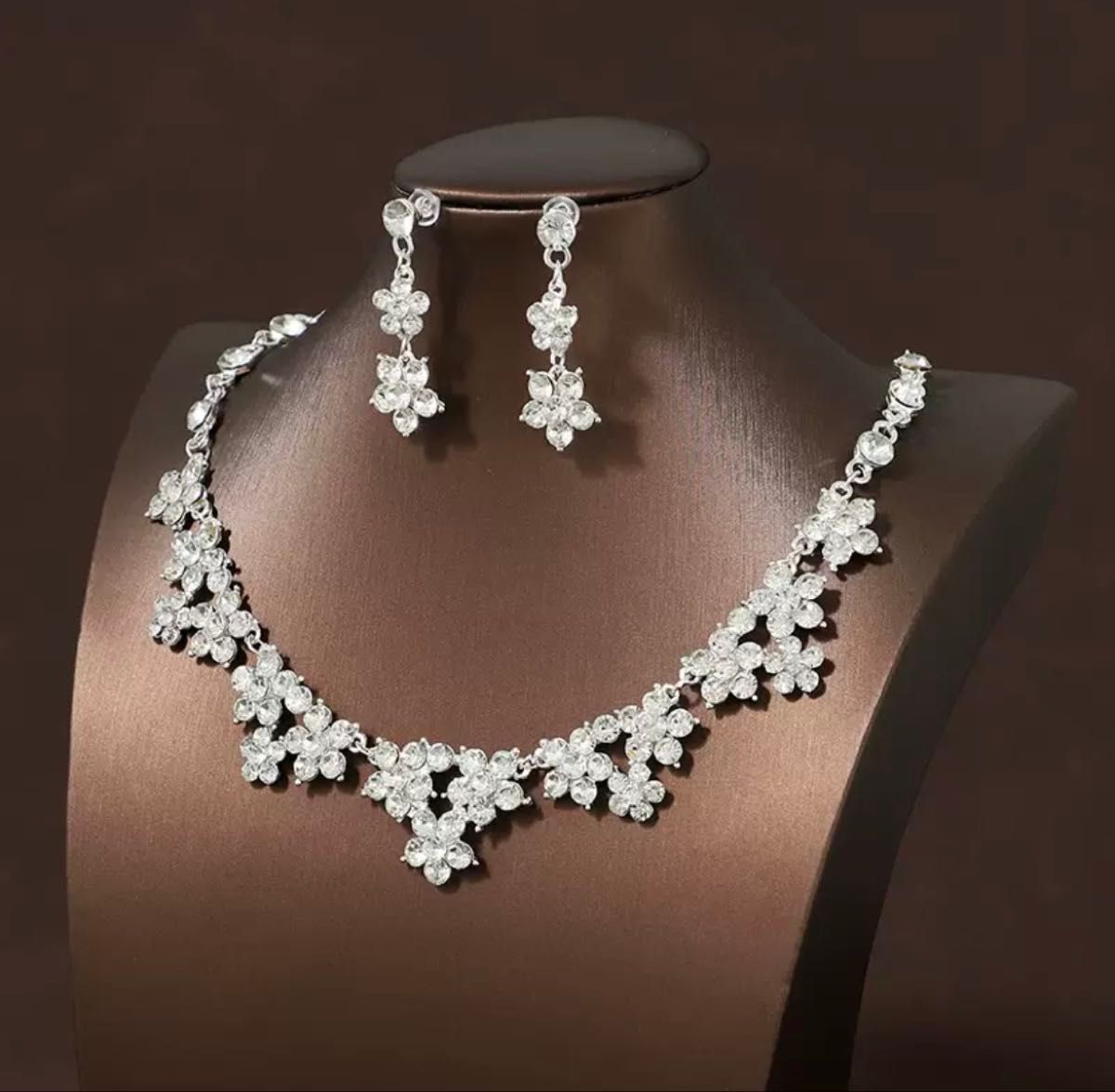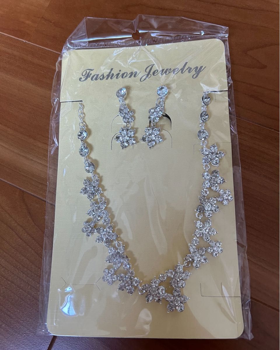 上品な輝きを放つシルバーカラーのネックレスとイヤリングの2点セットです。