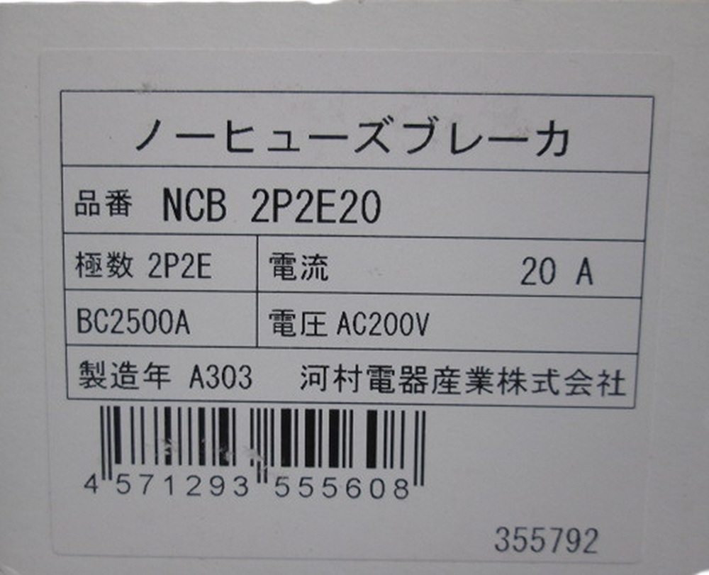 ノーヒューズブレーカ 2P2E 20A 河村電器 NCB2P2E20