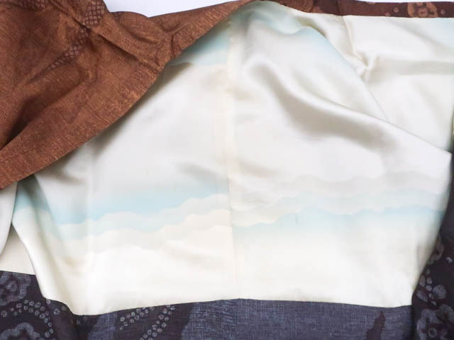 リサイクル商品のため、羽裏にしみがございますが着用可能なお品です。 地色は茶です。 1枚目の画像が近いお色かと思われます。 素材は正絹です。 |