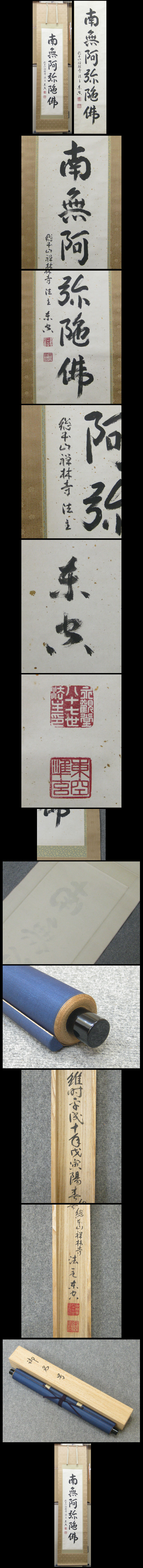 【森準玄 東空】 1918年(大正7年)岐阜市日置江の名門・青木家に生を受ける。 11歳で仏門に入いる。第二次世界大戦に従軍。戦犯生活を経て、昭和22年生還。 昭和42年から浄土宗西山禅林寺派宗学院講師、同45年から同学院舎監。 昭和52年2月より岐阜市中本山立政寺貫主に就任。羽島市の光照寺住職を兼務。 平成5年11月17日浄土宗総本山禅林寺87世法主に就任。 平成八年(1996)西山国師七百五十年遠忌法要厳修せられ、平成12年1月31日御退任。 著書・岐阜市の中本山 立政寺貫主時代に書かれた本 「地獄大菩薩」(白馬社)1991年4月25日初版発行ほか、「人生の道標」(白馬社)がある。 ★商品サイズ★ ■掛軸 206×49.5cm ■作品 136×33.5cm ★商品の状態★ 金箔がちりばめられています。 作品に少しの薄じみがありますが、概ね良い状態です。 時代など詳しくは画像にてよく確認のうえでご検討いただければと思います。 どうぞよろしくお願いいたします。 |