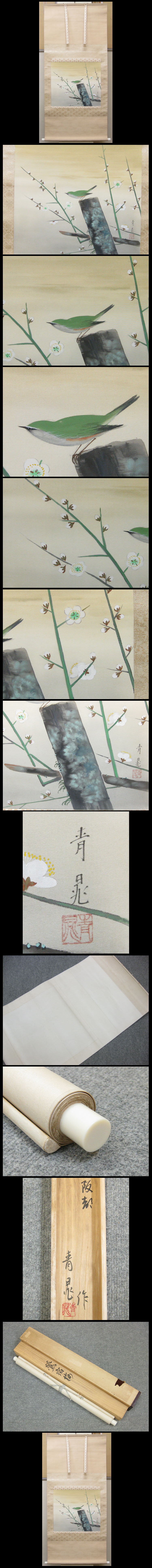 【諸永青晁】 明治39年佐賀県に生れる。 昭和6年に京都市立絵画専門学校を卒業して研究科に進み、 堂本印象に師事。第2回聖徳太子奉讃美術展に《春寒》で入選し、 8年の第14回帝展に《窓より》で初入選となり、11年秋の文展鑑査展に《葉桜》で入選した。 その後は、小林彦三郎立脇泰山等による大輪画院の同人となった。 戦後は21年に南画院の同人となり、29年には泰山山田暗斉らと新美術協会を結成し、 創立会員として定期展に出品を重ねた。昭和46年没。享年66才。 ★商品サイズ★ ■掛軸 142×65cm ■作品 45×51cm ★商品の状態★ 概ね良い状態です。 時代など詳しくは画像にてよく確認のうえでご検討いただければと思います。 どうぞよろしくお願いいたします。 |