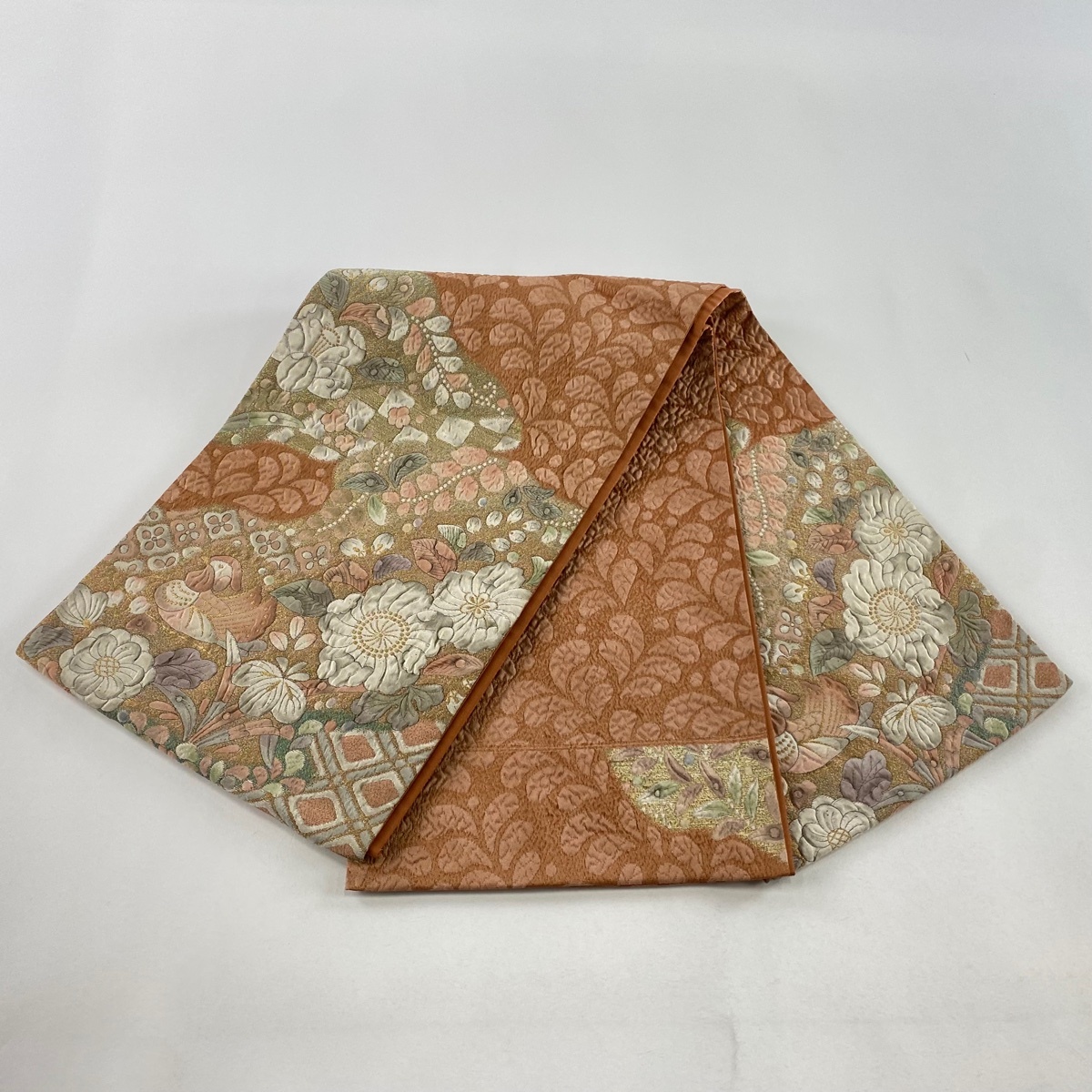 | 袋帯 美品 秀品 辻が花柄 鳥 金糸 薄オレンジ お太鼓柄 正絹 【中古】 |
