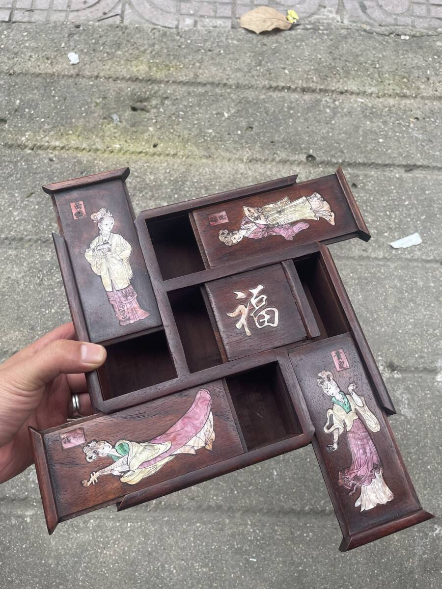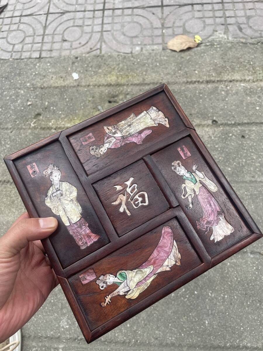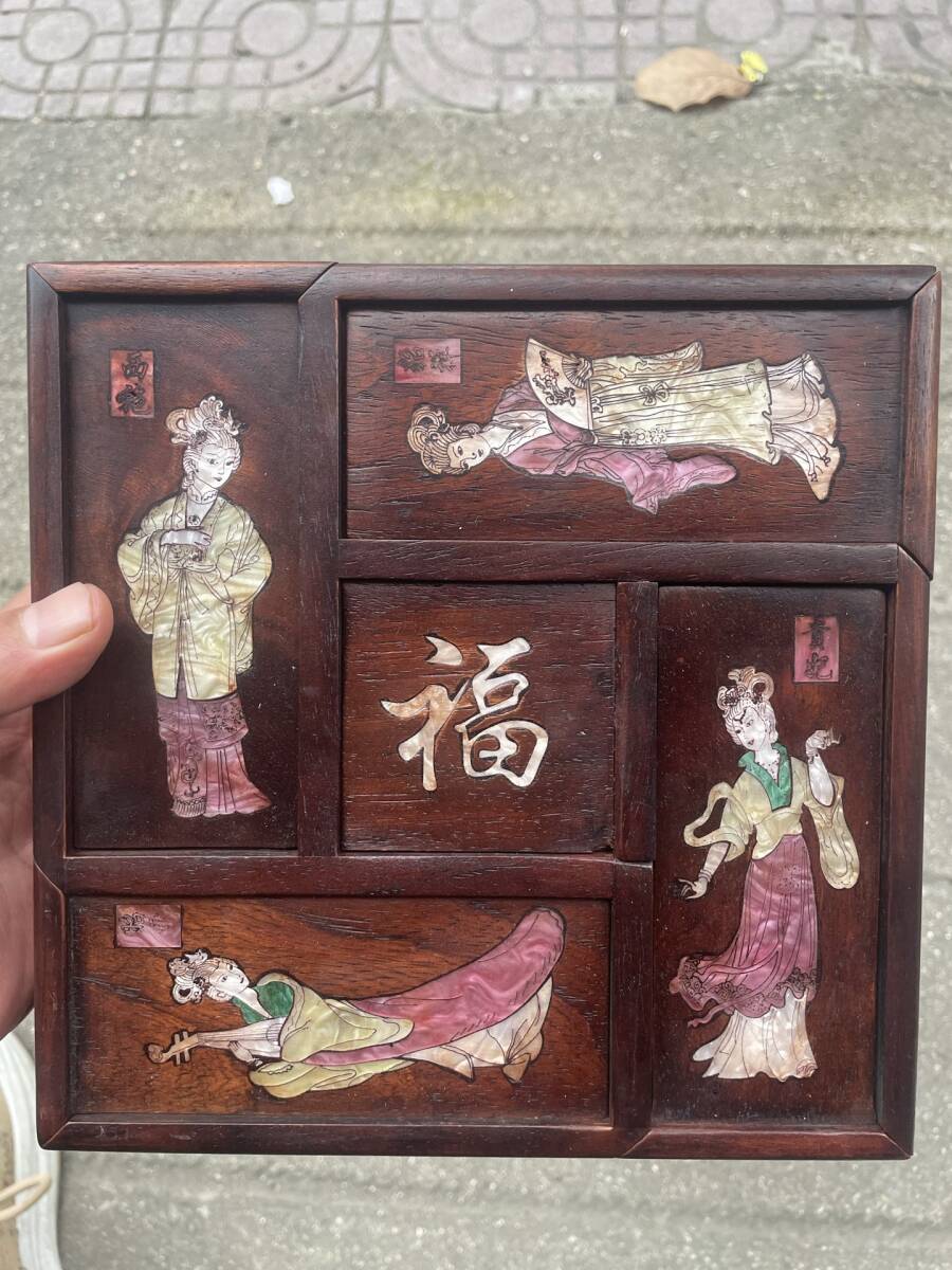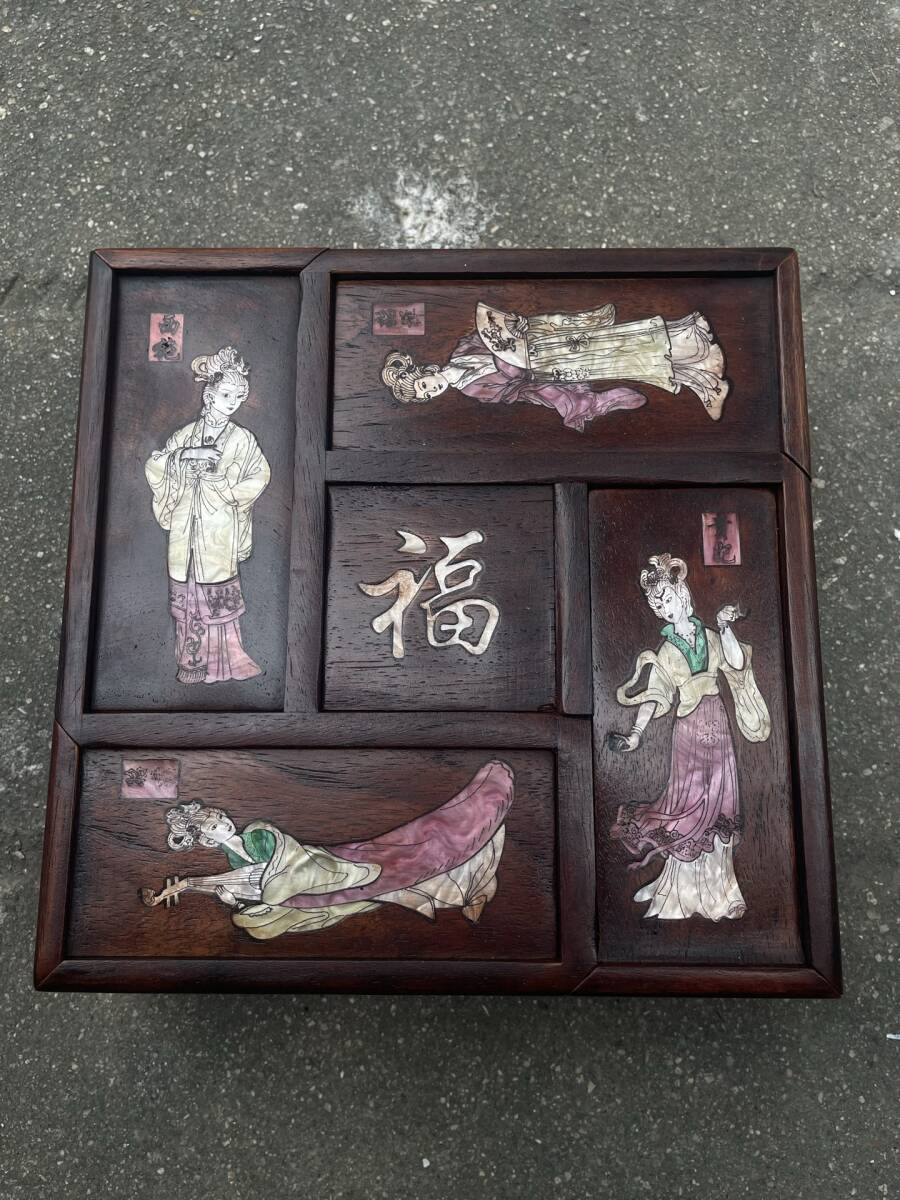 【超珍館蔵】花梨木製 細密彫 貝殼嵌 四大美女紋 五開盒 置物 賞物 古賞物 古美術品 稀少珍蔵品