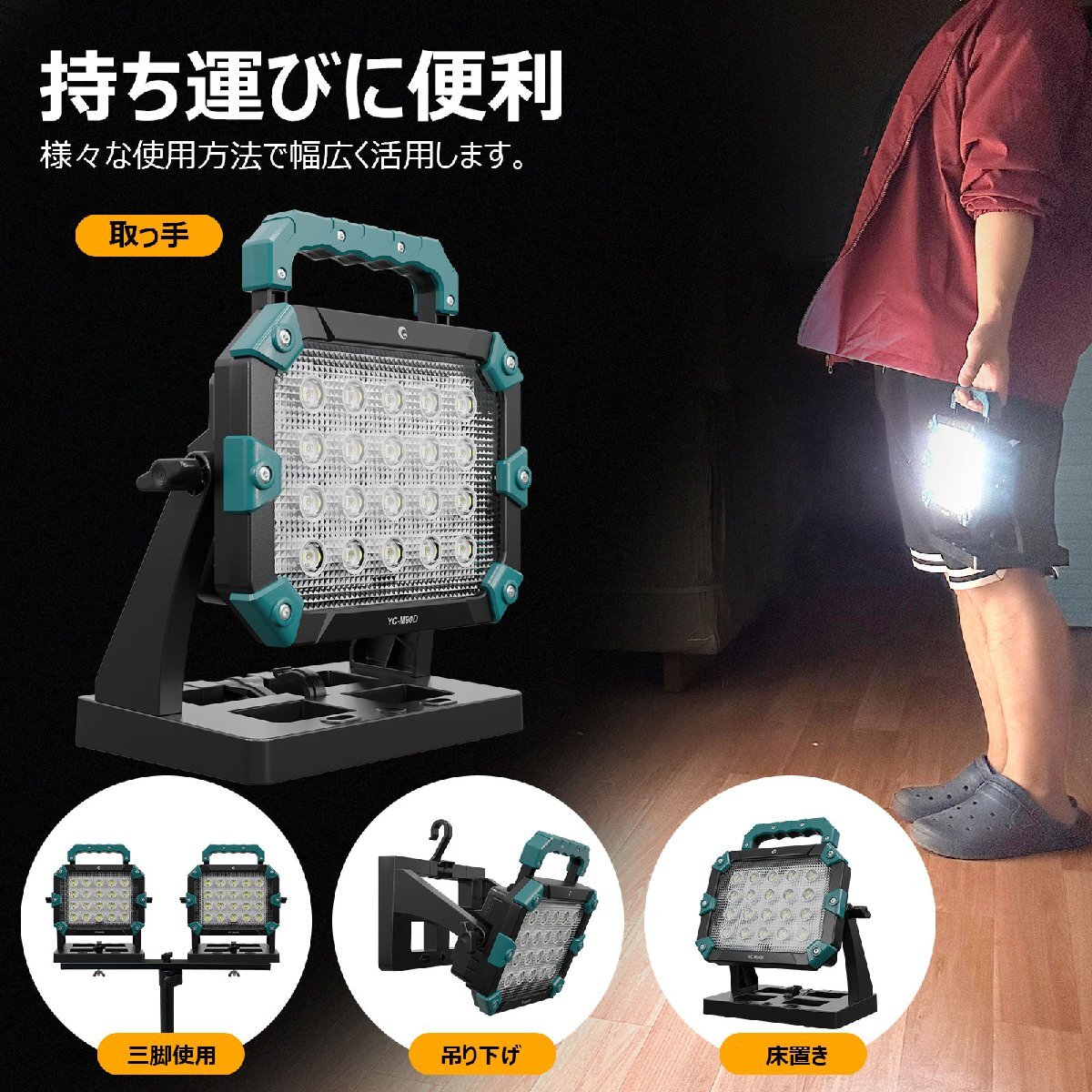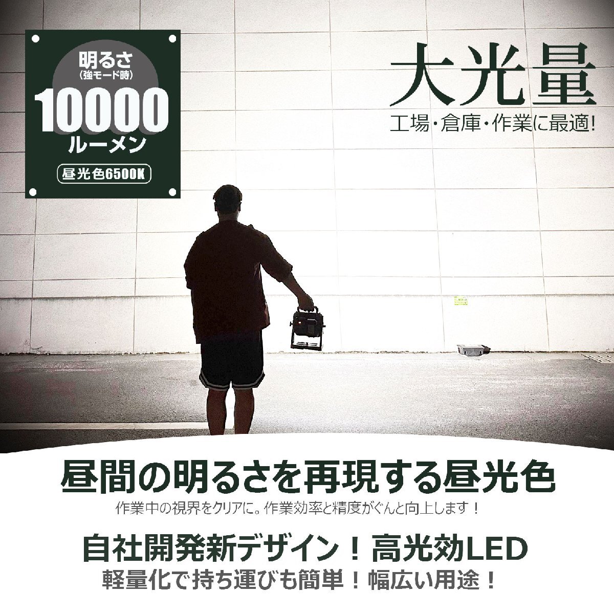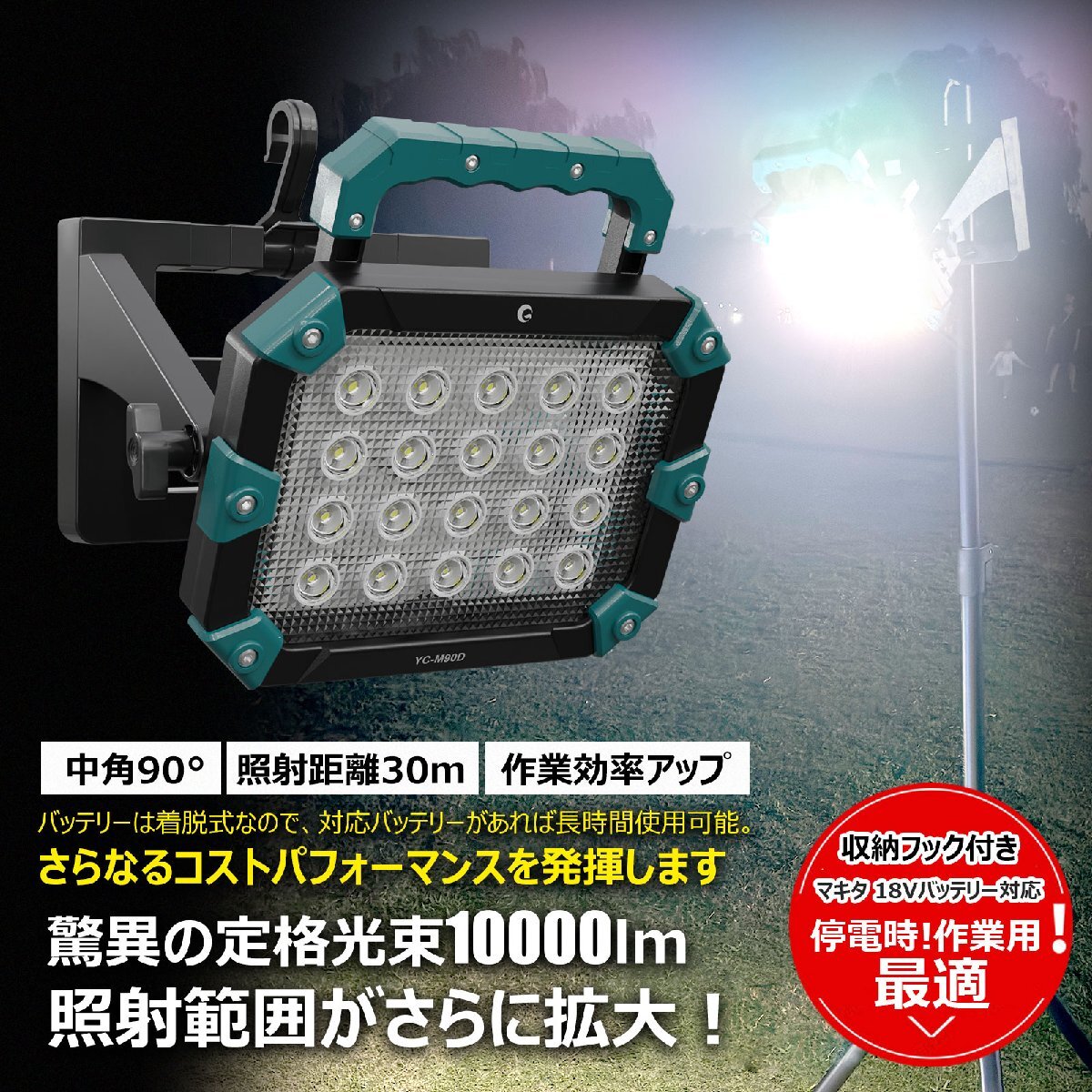 ★オススメポイント★ 簡単・便利・パワフル! 着脱式バッテリーで、充電も交換もスムーズ。キャンプや作業現場でもお手軽にご使用頂けます。 驚きの明るさ!充電式投光器トップクラスの10,000LM! 100Wのパワーで、30m先までしっかり照らします。作業現場の視野・安全を確保! ワンスライドで交換、使いたい時にすぐに! 18Vバッテリー2~6Ah全部対応可能!簡単に交換できるから、充電切れの心配なし!いつでも明るさを確保します。 使用者のニーズに応える3way設計! 床置き・手持ち・フック!床に置くだけ、手持ちで移動中の使用も楽々、フックで掛けてハンズフリー! 多機能設計で、ニーズにぴったりフィット! どんな現場でも安心の耐衝撃設計 高い耐衝撃性能で、落下や衝撃からしっかりガード。安心してお使いいただけます。 外でもスマホに充電出来るUSB出力機能! 投光器のUSB出力で、スマホやタブレットを手軽に充電! 三脚スタンドに最大2台搭載可能! 投光器2台搭載可能な三脚スタンドで、照明の角度や高さを自在に調整。更なるパワフルな照明を実現。 ※三脚スタンド別売りとなります。 |