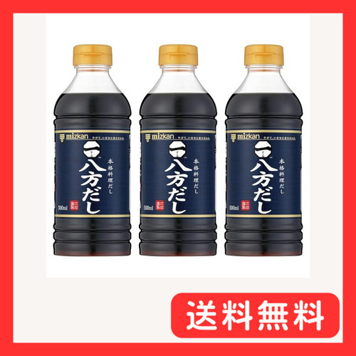 「ミツカン 八方だし 500ml ×3本 めんつゆ」▼4902106648383▼(商品説明)「ミツカン 八方だし 500ml ×3本 めんつゆ」▼4902110000000▼(商品説明)-/500ミリリットル (x 3)/-・PatternName:八方だし(500ml×3本)・パッケージ個数:3・原材料:しょうゆ(小麦・大豆を含む)(国内製造)、砂糖、食塩、みりん、酵母エキス、かつおぶし(粗砕、粉砕)、こんぶだし、醸造酢・栄養成分:100ml当たり エネルギー:118kcal、たんぱく質:3.3g、脂質:0g、炭水化物:26.2g、食塩相当量:13.8g・アレルゲン:小麦、大豆・一流の料理人が認める「本格料理 だし ( 出汁 )」です。・色々な麺にお使い下さい。用途例: そばつゆ 、 そうめんつゆ 、 うどんつゆ ( うどんスープ )醤油・鰹だし・甘みを絶妙なバランスで合わせた、一流の料理人が認める「本格料理だし」です。煮物・炊き込みご飯・親子丼、鍋物など、八方いろいろな料理の味のベースとしてお使いいただけます。これ1本の味つけでもおいしく召し上がっていただけます。素材の旨みと香りを生かす原材料選びと、だし本来の味わいが活きるこだわりの味です。独自の「香