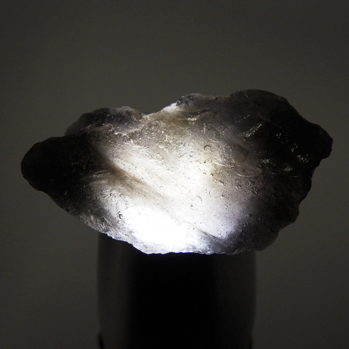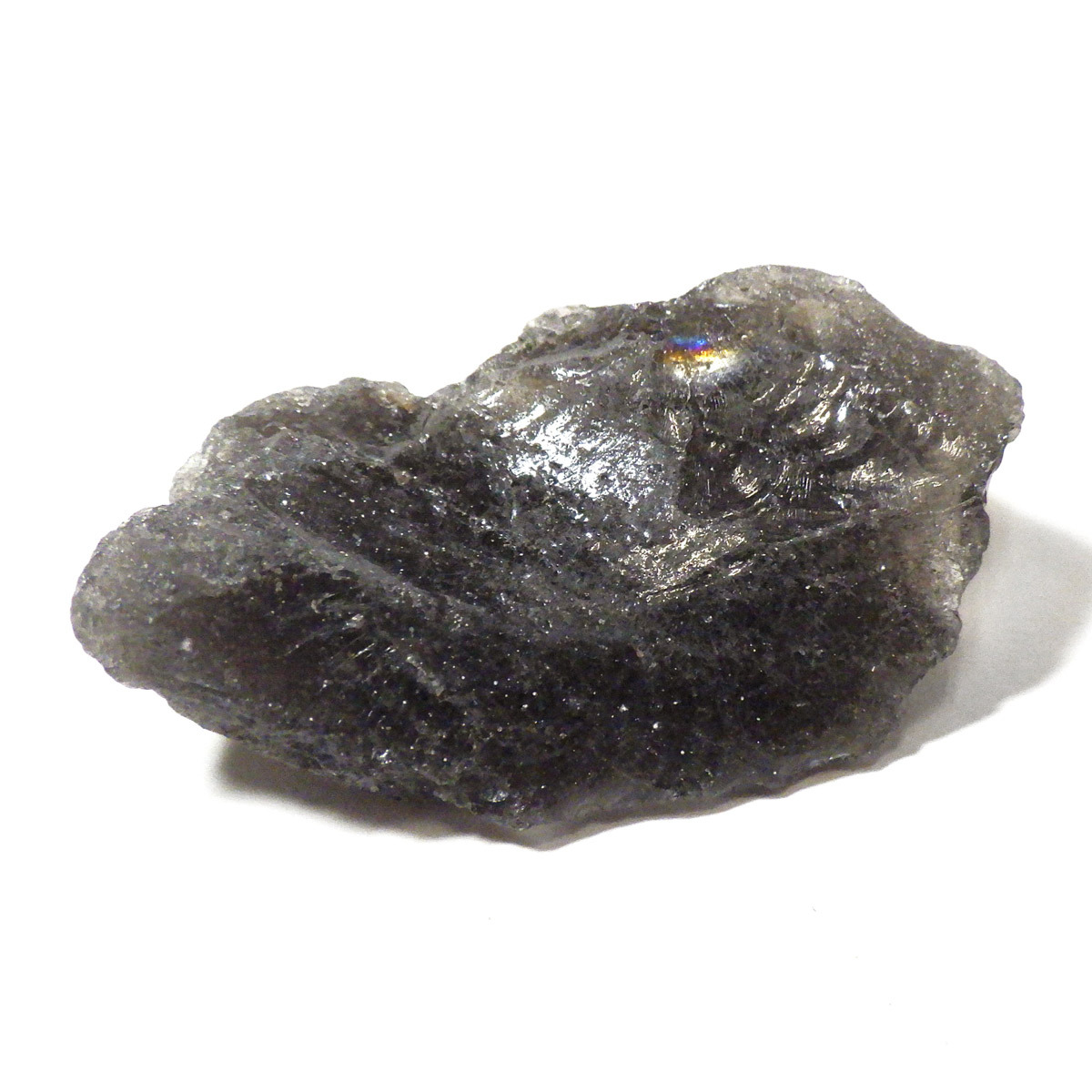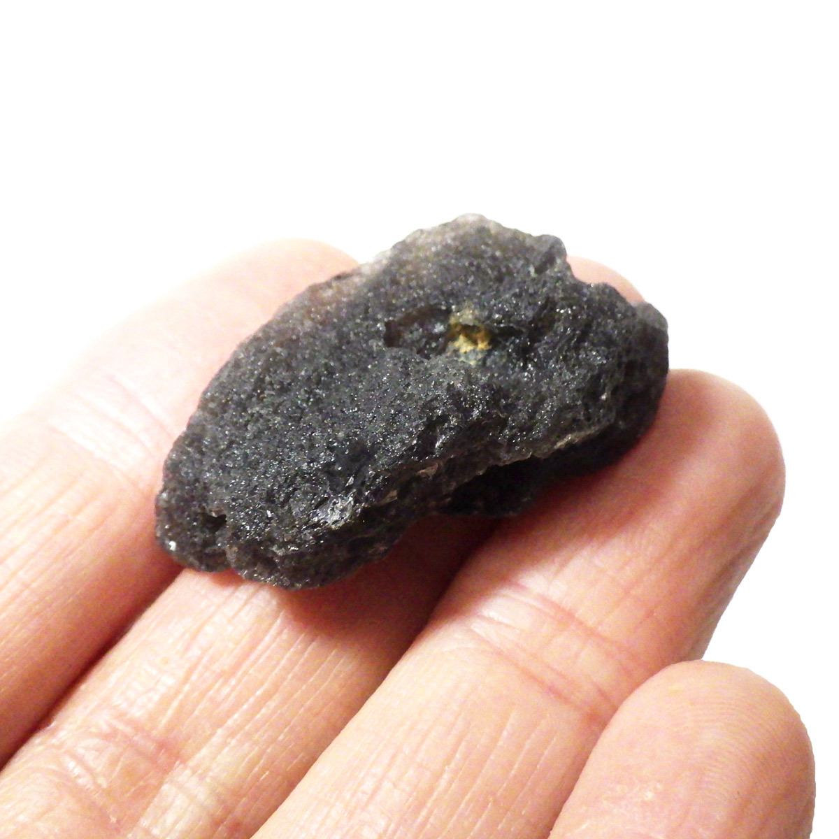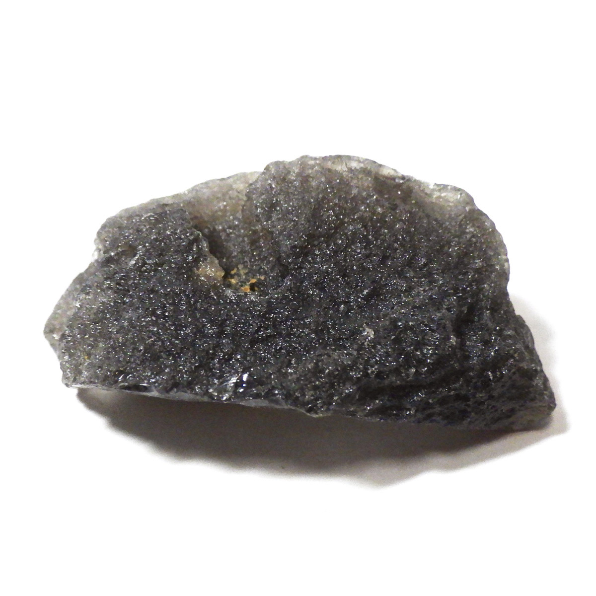 インドネシア・ジャワ島で採掘される希少な天然ガラスであるアグニマニタイトの原石です。アグニマニタイトの石の名前は、サンスクリット語で「火の神」を意味するアグニと「宝石」を意味するマニに由来し、「火の宝石」として知られています。表面はマットな黒~グレーの質感で、ごつごつとした天然のテクスチャが魅力的。光に透かすと、ほんのりスモーキーで神秘的な雰囲気を放ちます。フォルムや質感が面白い原石です。鉱物コレクションやお守り、アクセサリー制作にもおすすめです。