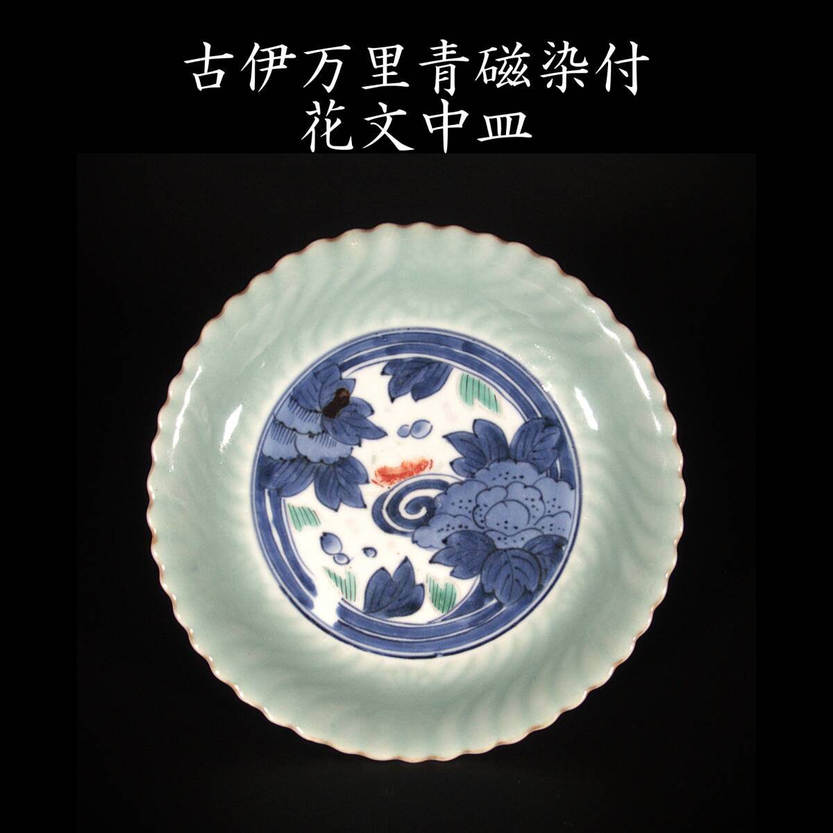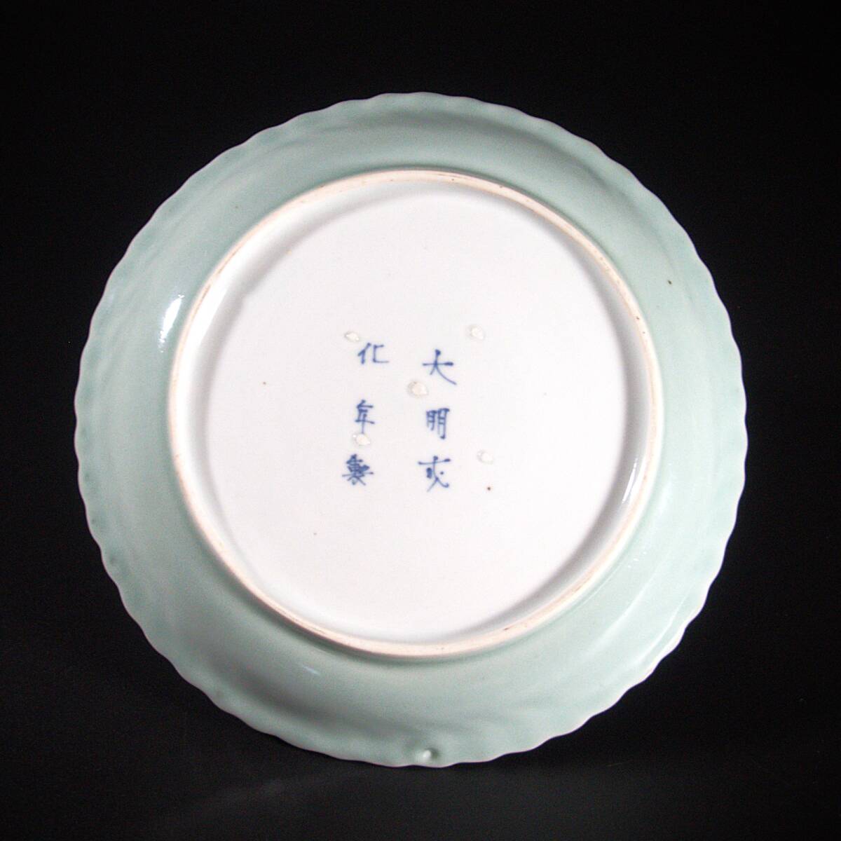 ■ 商品説明 淡い青磁釉が穏やかに発色した中皿で、見込みには染付で花文が描かれています。 青磁の部分には菊の文様が陽刻で施され、光を受けてやわらかく浮かび上がるような趣があります。 また、染付の青に加えて緑と赤が差し色として用いられ、上品さの中に華やかさが感じられる仕上がりです。 裏面には「大明成化年製」の銘が入っており、古伊万里初期の様式をよく示しています。 |