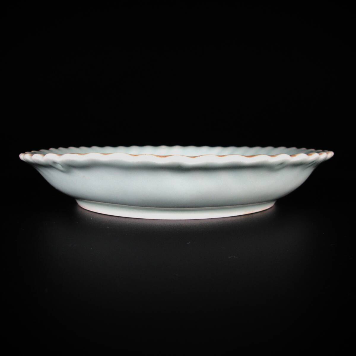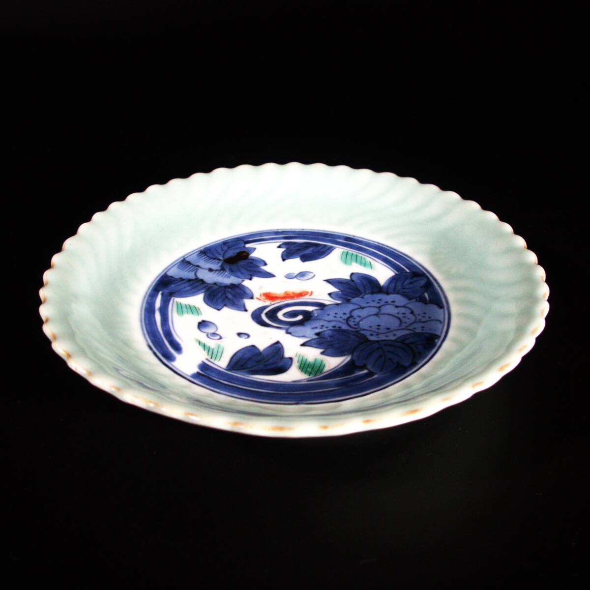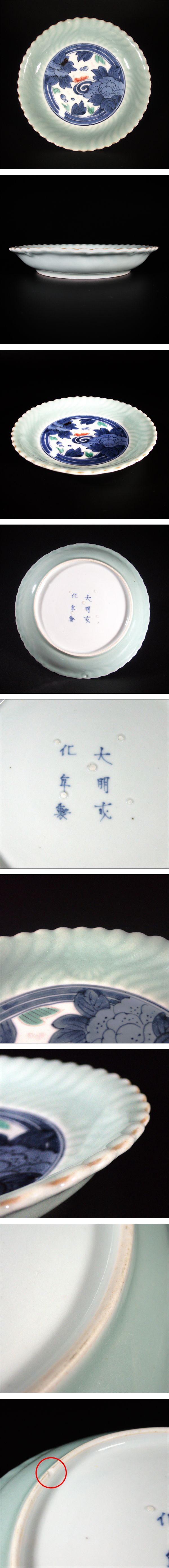 ■ 商品説明 淡い青磁釉が穏やかに発色した中皿で、見込みには染付で花文が描かれています。 青磁の部分には菊の文様が陽刻で施され、光を受けてやわらかく浮かび上がるような趣があります。 また、染付の青に加えて緑と赤が差し色として用いられ、上品さの中に華やかさが感じられる仕上がりです。 裏面には「大明成化年製」の銘が入っており、古伊万里初期の様式をよく示しています。 |
