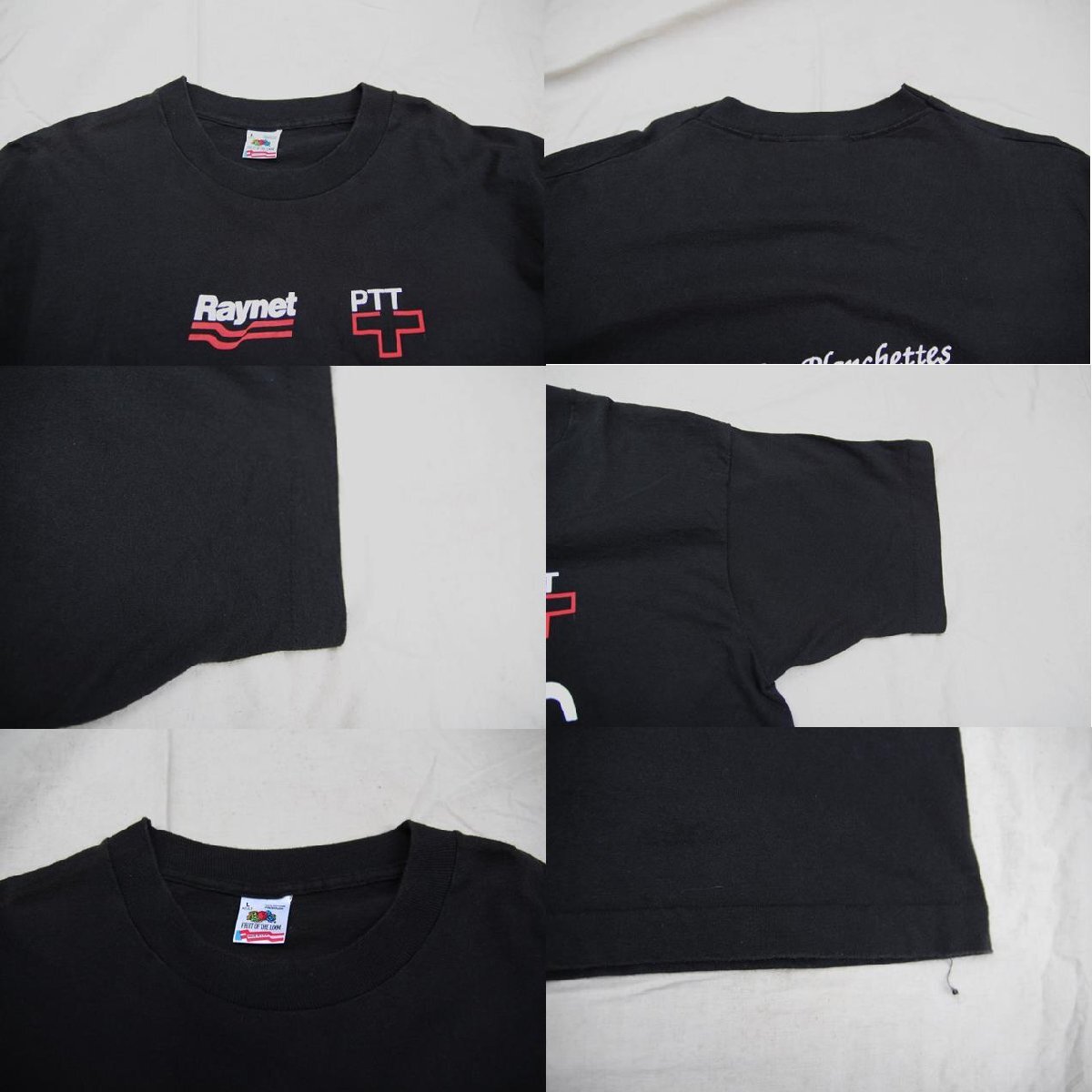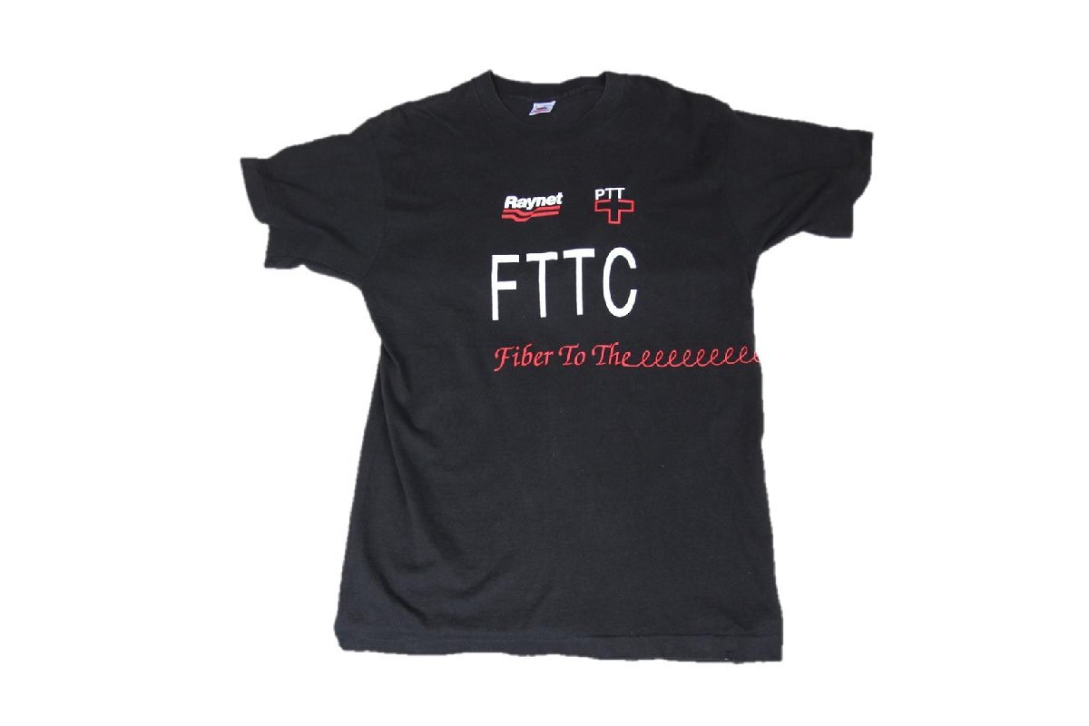 1990年頃のFruit Of The Loom製のプリントTシャツとなります。フロントとバックのプリントが繋がっている様なデザインとなり、プリントはFTTCの文字と豚が電話線の様な配線で繋がられているデザインから恐らくNetwork Technologyの企業系Tシャツとして製作された物かと思われます。フルーツボディらしく多少身幅がタイト目で着丈が長いシルエットとなります。デザイン性が高いプリントですし、USA製なのでお好きな方は是非ご検討下さい。