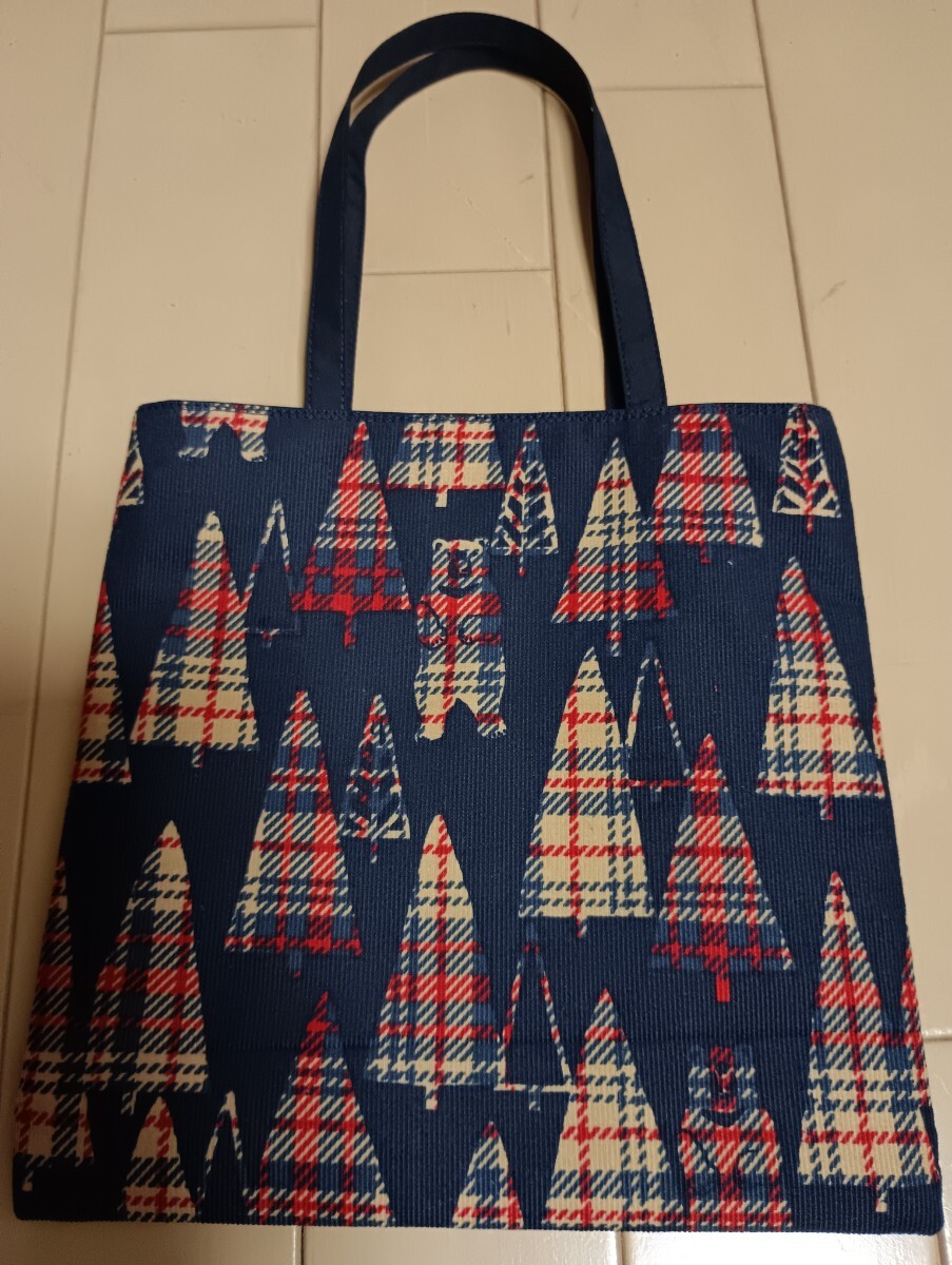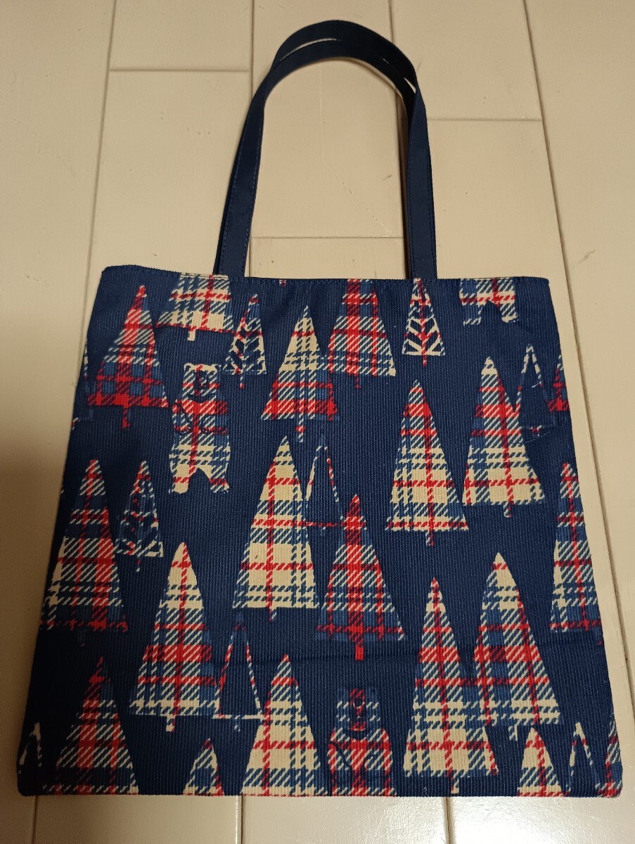 ハンドメイド 紺色のツリー&クマ柄&チェック柄のコーデュロイ生地の小さいバッグです。中は紺色の生地です。ポケットはありません。