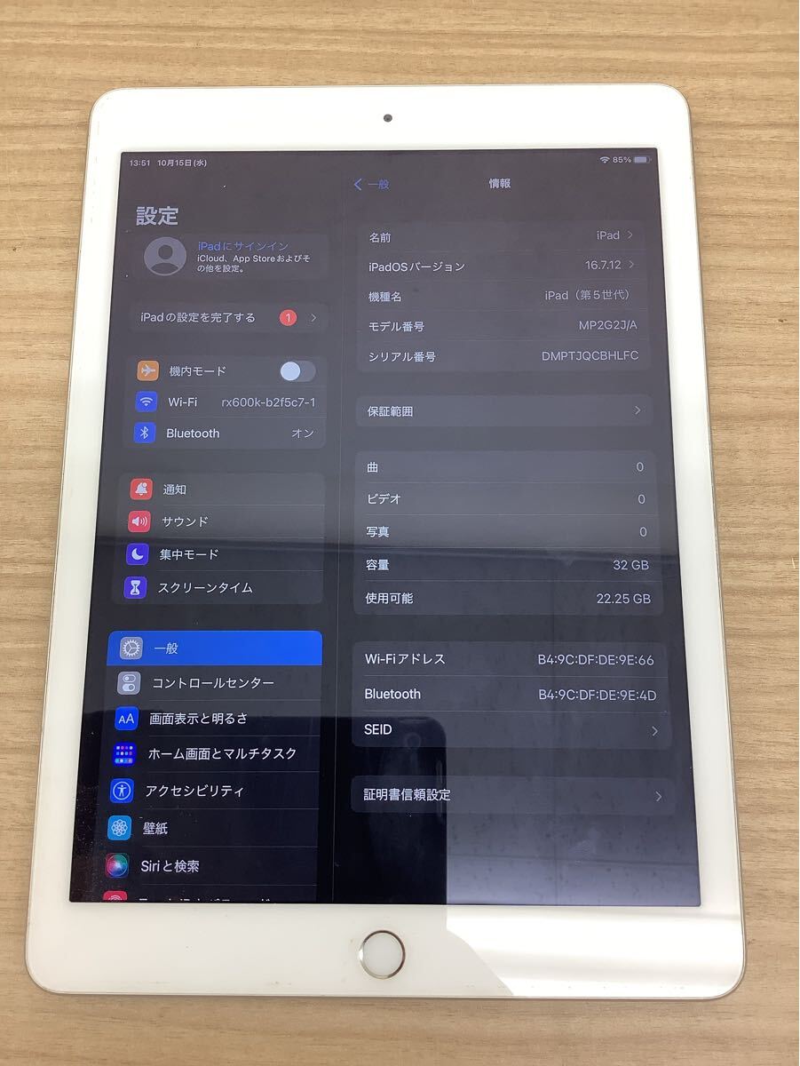 Apple iPad 第5世代 32GB MP2G2J/A A1822 iPadOS16.7.2 Wi-Fiモデル 初期化済み 現状品