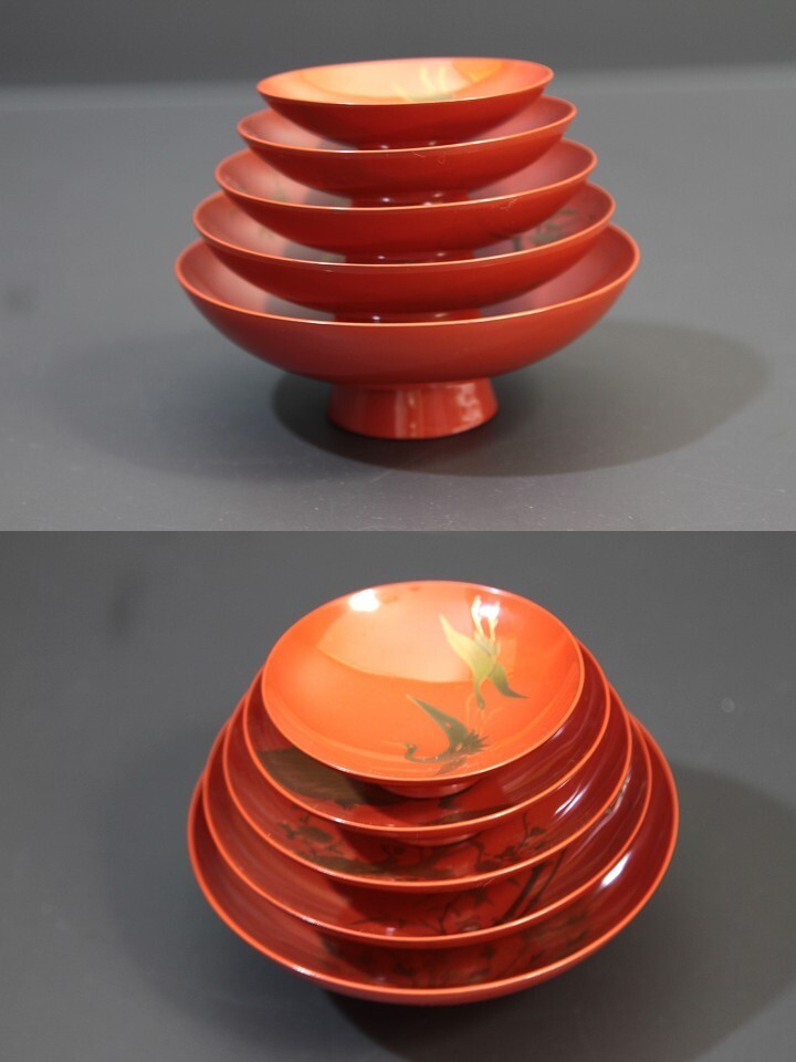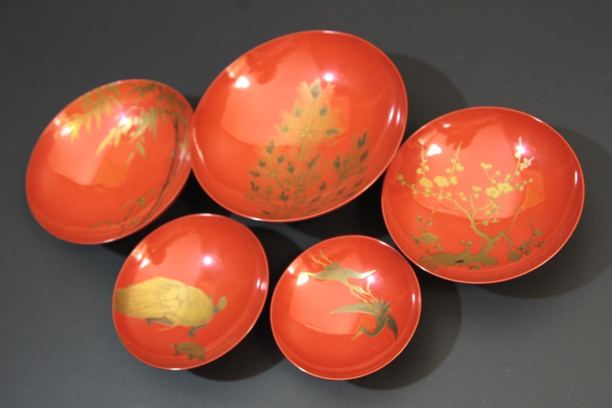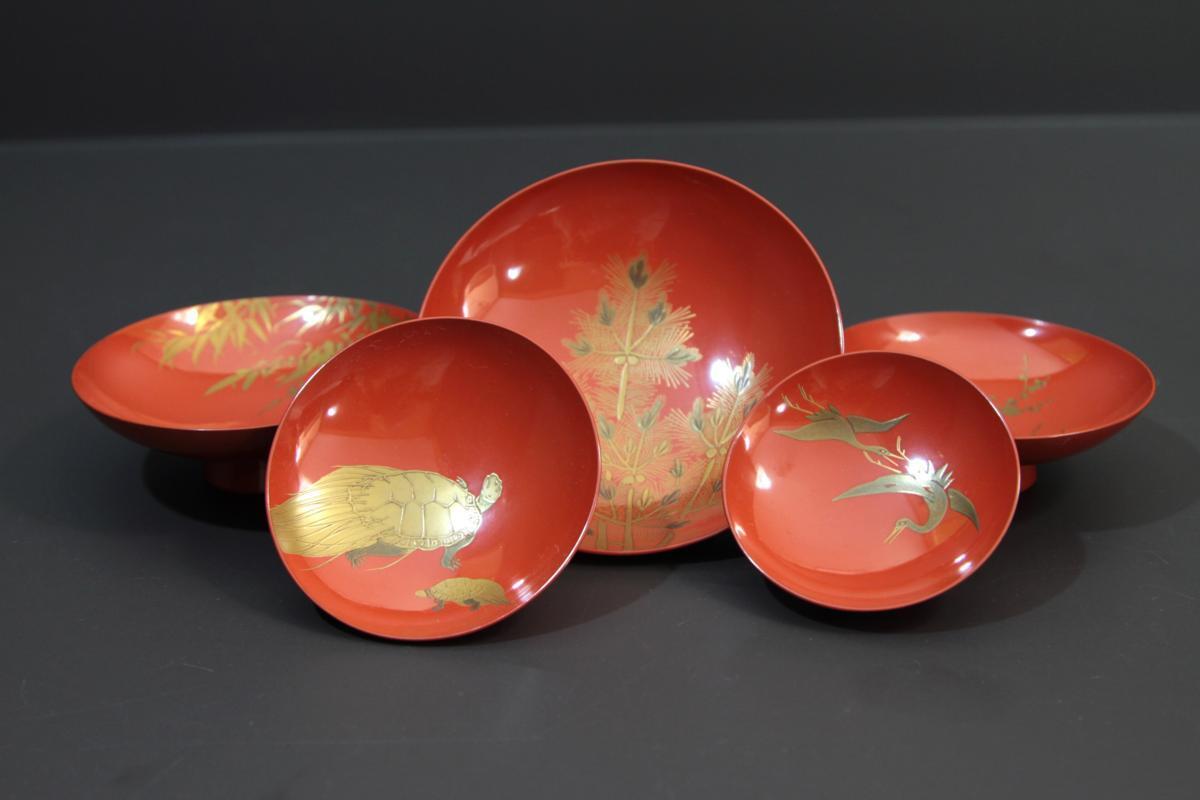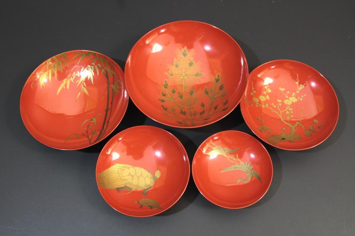 ★★★ 木製 朱塗り 鶴亀松竹梅蒔絵 五つ組盃 ★★★