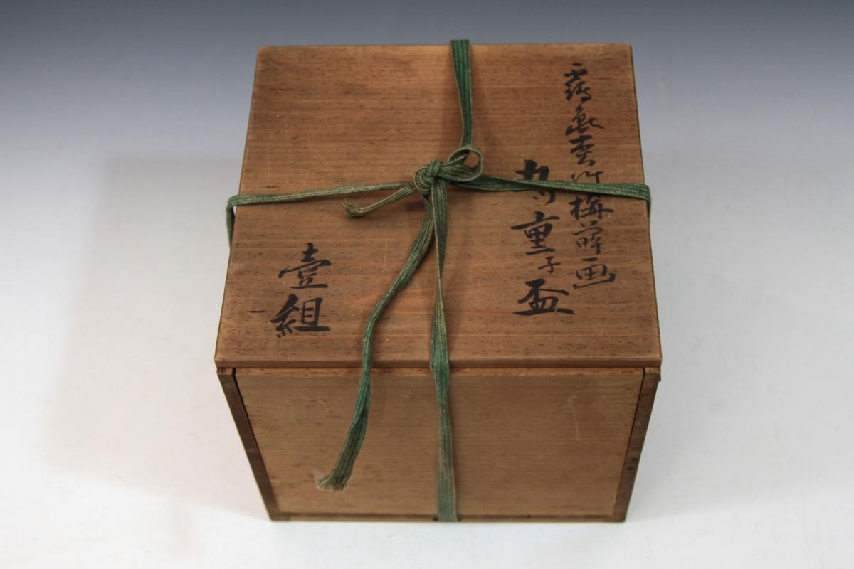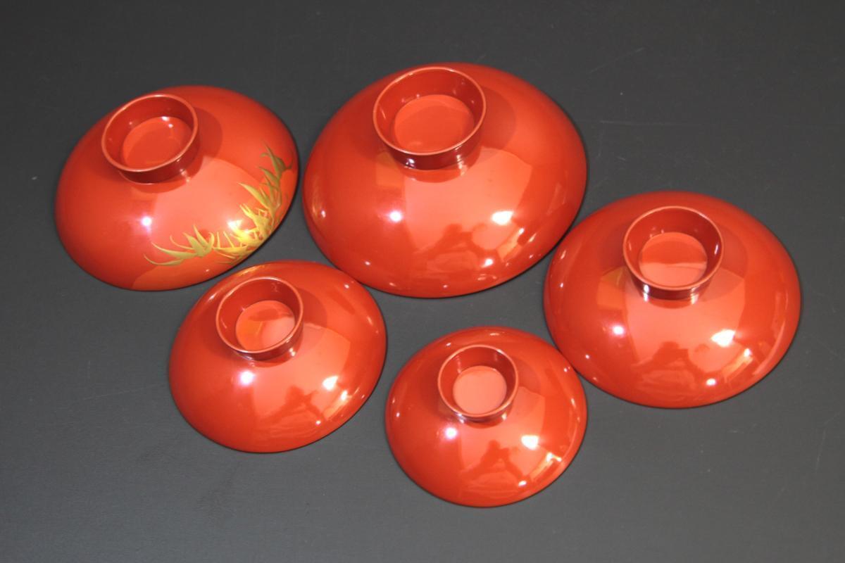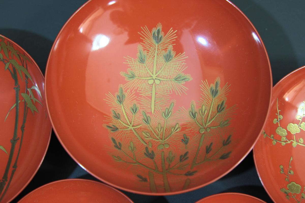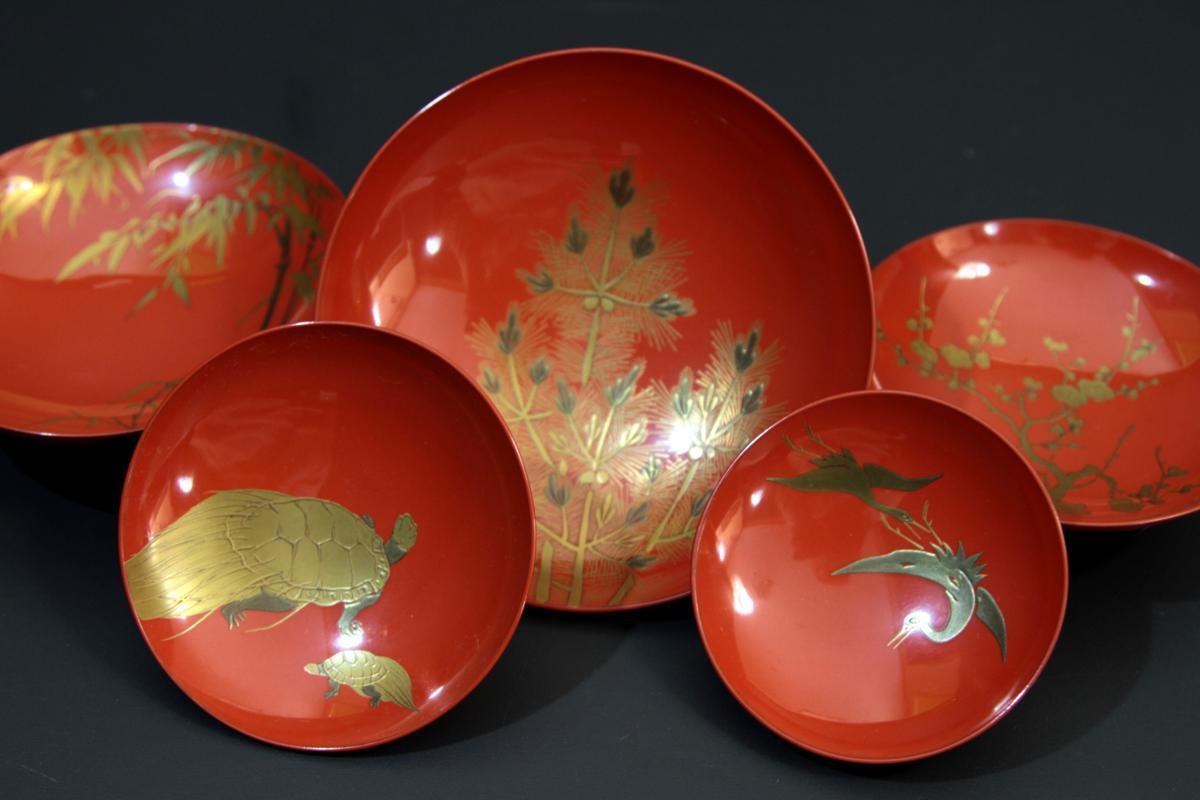★★★ 木製 朱塗り 鶴亀松竹梅蒔絵 五つ組盃 ★★★