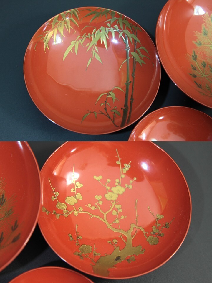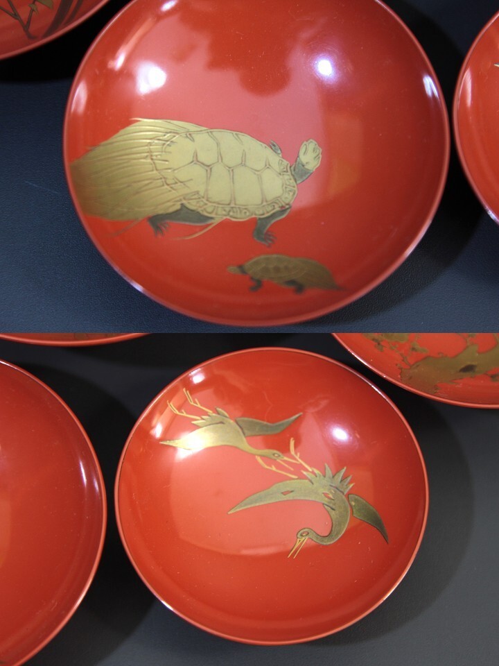 ★★★ 美品 木製 朱塗り 鶴亀松竹梅蒔絵 五つ組盃 ★★★