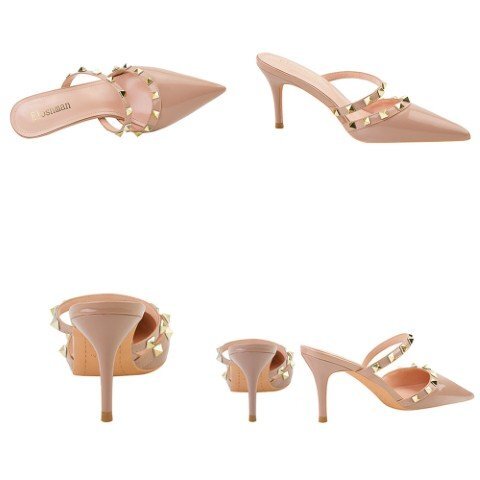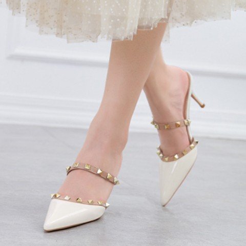 ミュールサンダル リベット ヒールサンダル ポインテッドトゥ 美脚結婚式 靴 パーティー 大人可愛いシューズ エレガント