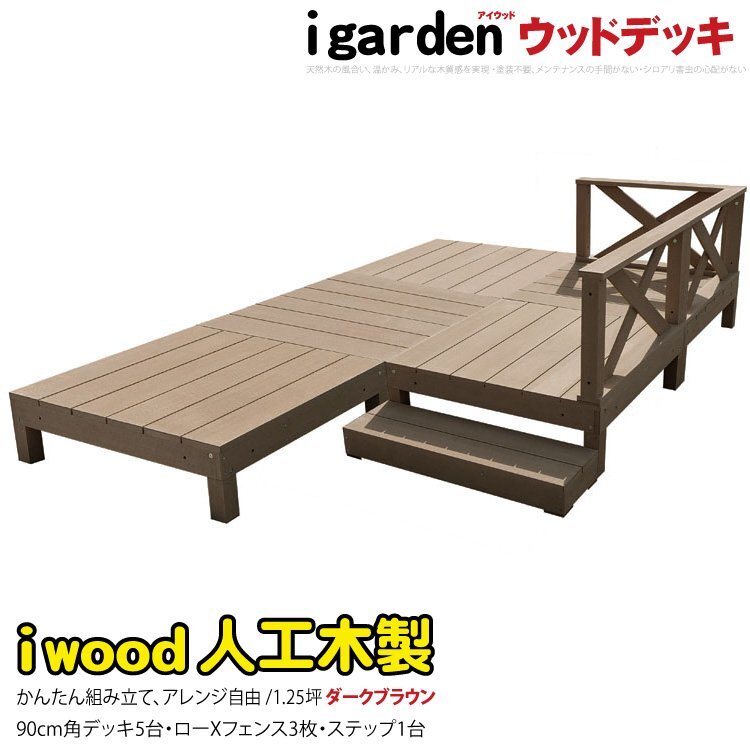 igarden アイウッドデッキ 9点セット(デッキ5・クロスローフェンス3・90ステップ1)1.25坪 ダークブラウン 樹脂製 テラス 庭 -5d3x1sdb