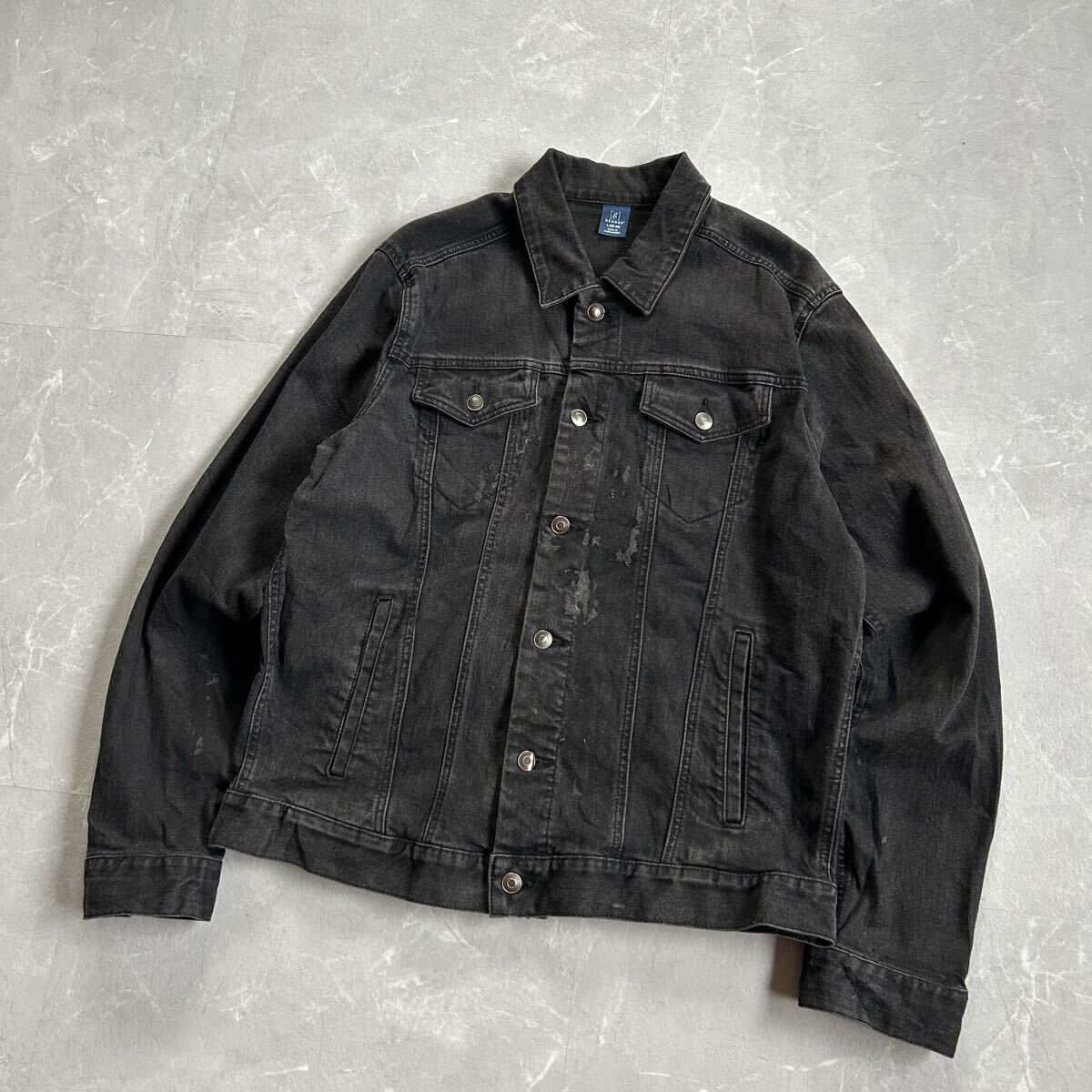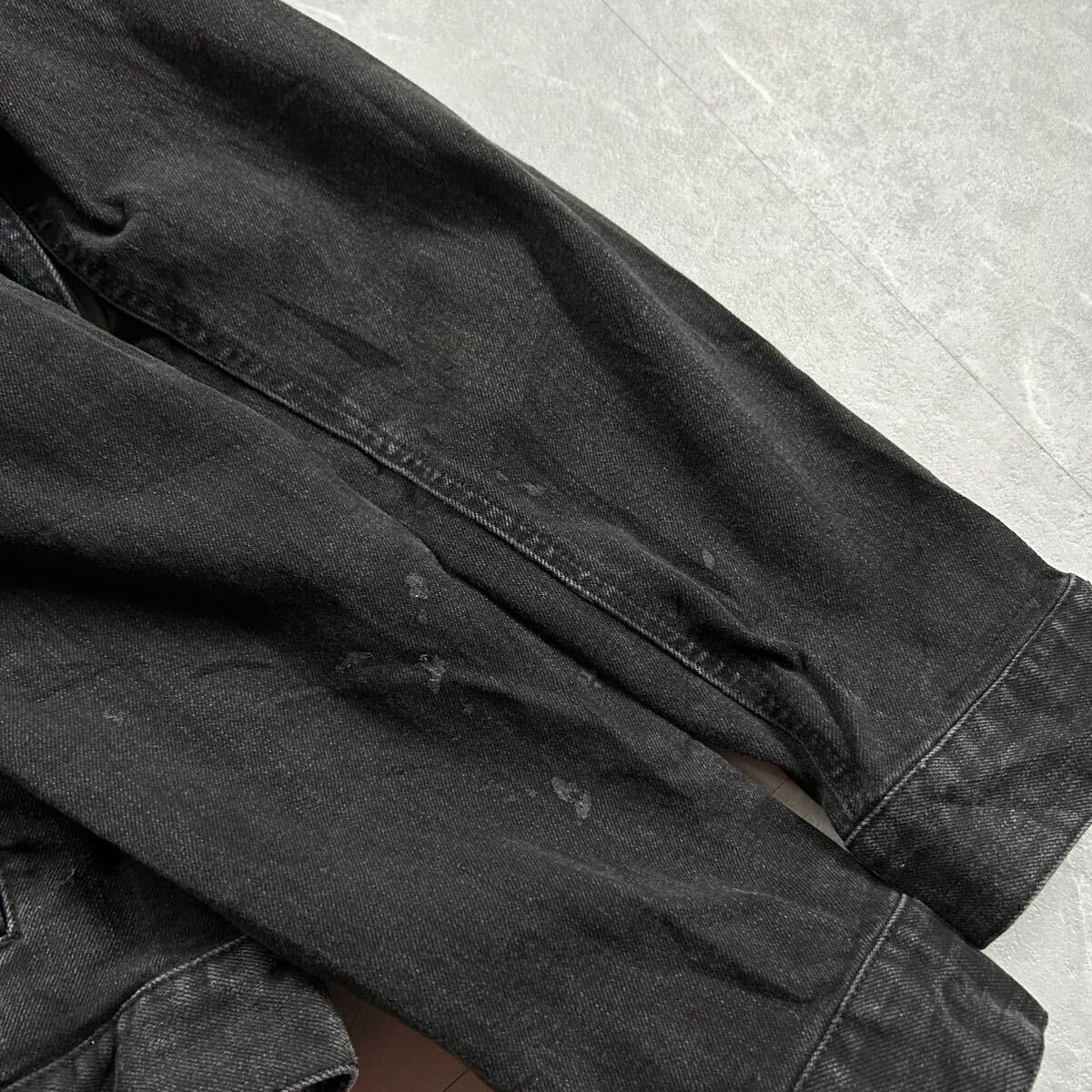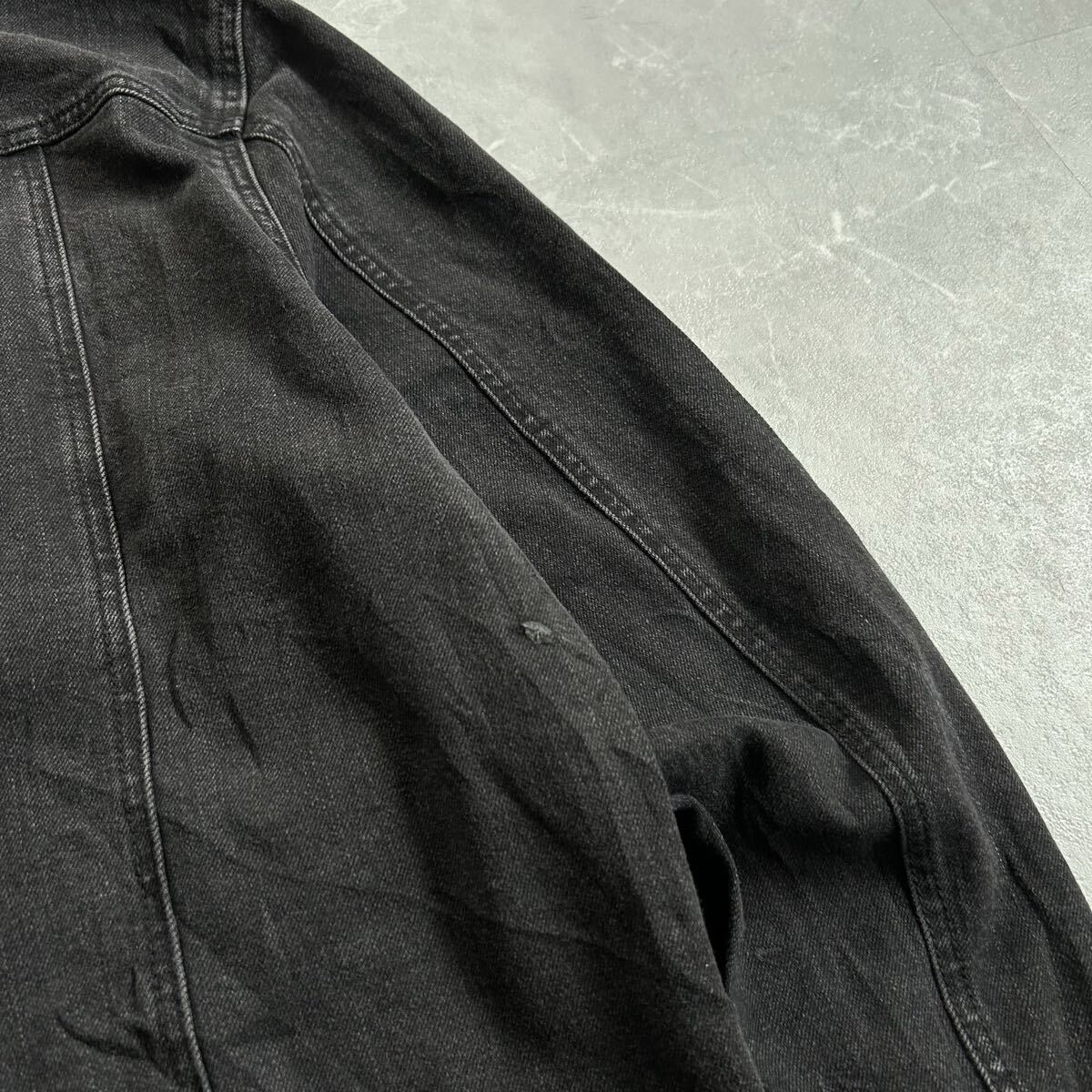 90s〜00s GEORGEのブラックデニムジャケットになります。近年では、古着のブラックデニムジャケットは希少かと。また、ポリやレーヨンが入っているのでゴワゴワ感なく着心地が良いのでオススメです。