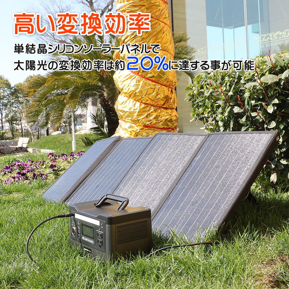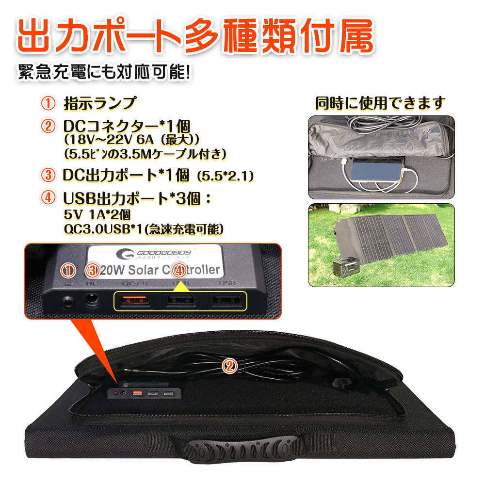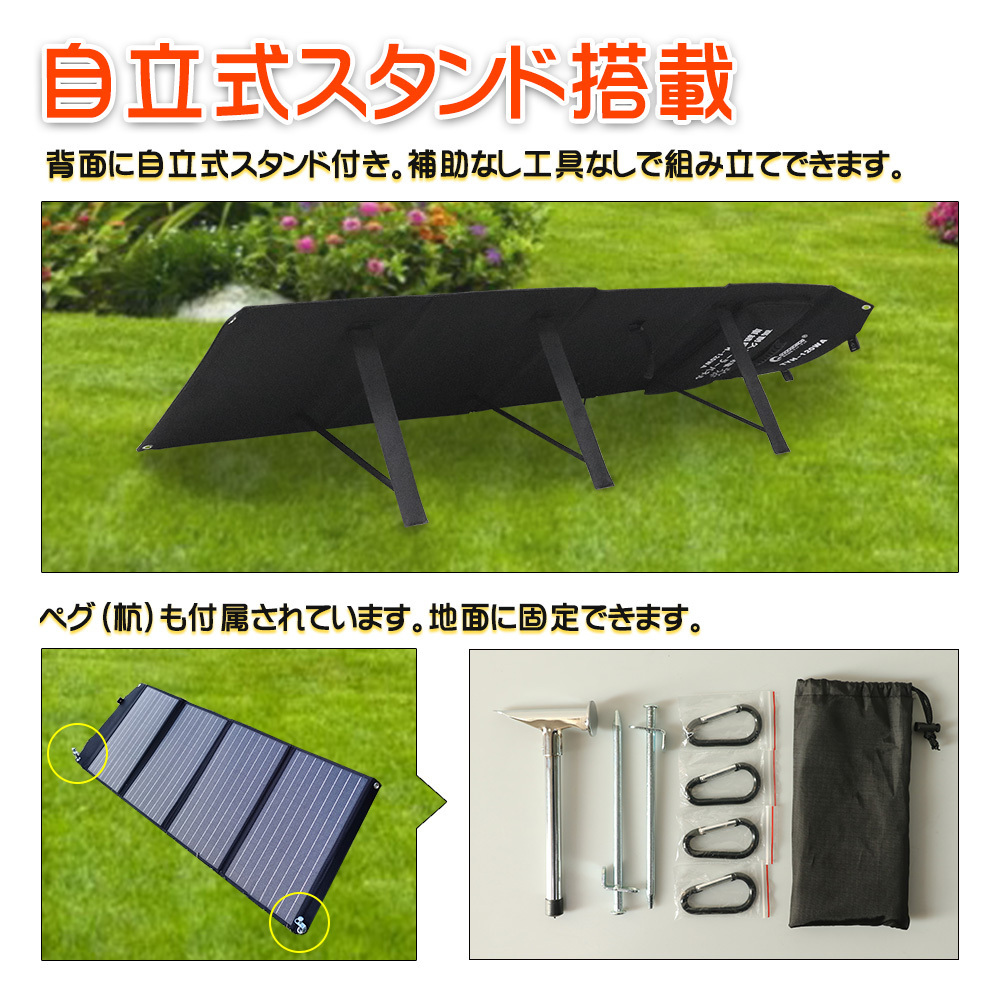 ★オススメポイント★ 高い転換効率 最先端技術の単結晶シリコンソーラーパネルを採用。単一の結晶状態のシリコン型半導体を組み合わせた高効率ソーラーパネルを4枚搭載しました。太陽光の20%転換効率を実現しました。 薄型コンパクト&折畳み 小型かつ軽量で持ち運びやすい折り畳み式。折り畳むと持ち手付きのカバン形状にすることができ、一人で持ち運びも設置も簡単に扱う事ができます。 また、四隅にある穴は、リュック・バックパック・テントの・木にかけたり、ペグを挿して固定するにも便利です。 日頃のご使用だけでなく、旅行、キャンプ、ハイキング等も最適、地震など災害時にも非常用電源としても大活躍! 自立式スタンド搭載 背面に自立式スタンド付き、補助な工具無しで立てる事が出来ます。 ペグ(杭)も付属されています。地面にしっかり固定できます。 DC&USB出力ソーラーチャージャー ソーラー充電器として、USB出力端子最大3Aの高出力口3個付き、急速充電対応可能! DC出力ポット(内径2.1mm*外径5.5mm)*1個付き DCコネクター*1個(18V~22V 6A(最大))には3.5Mのケーブル付。ソーラーパネルから離れた場所の蓄電池に繋いで出力・充電が可能。 | |||