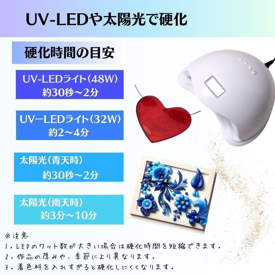 * 使用する着色料、他社製のレジン液、色付け材料や封入物の量と相性によっては、レジン液が固まらない、または変色することがありますのでご注意ください。