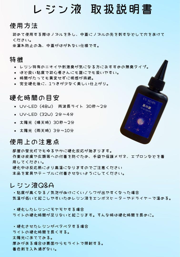 レジン液特有のニオイが気になる方に。刺激臭等ありません。お子様からニオイに敏感な方まで初心者の方でも誰にでも使いやすい。