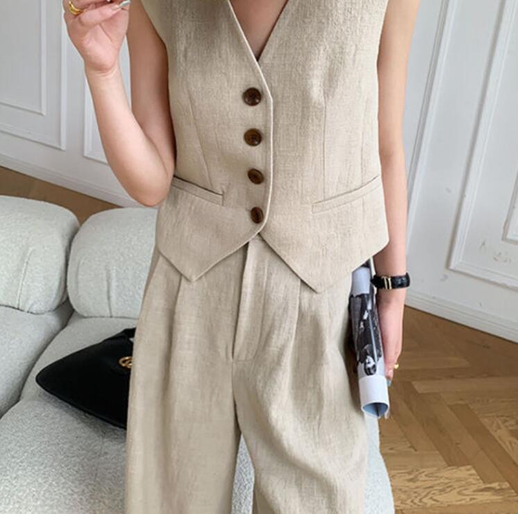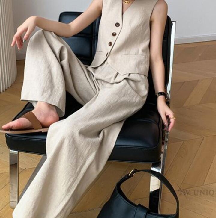 新入荷セットアップ レディース ベスト ワイドパンツ 綿麻 ジレ ベスト2点セット パンツスーツ 春 秋 夏 着痩せ お洒落/杏色M