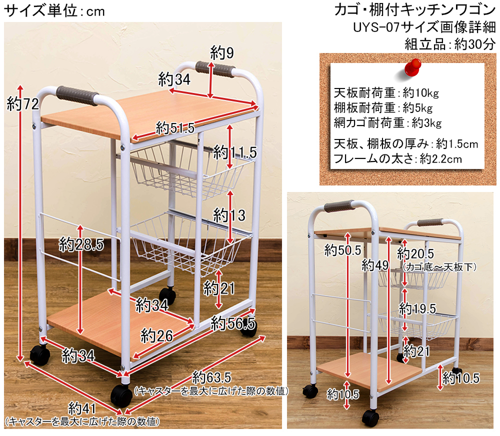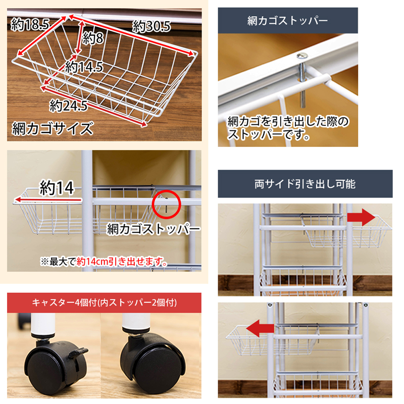 | 耐荷重 | 天板約10kg 棚板約5kg 網カゴ各約3kg |