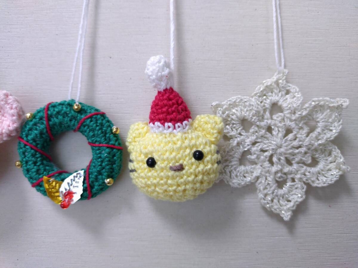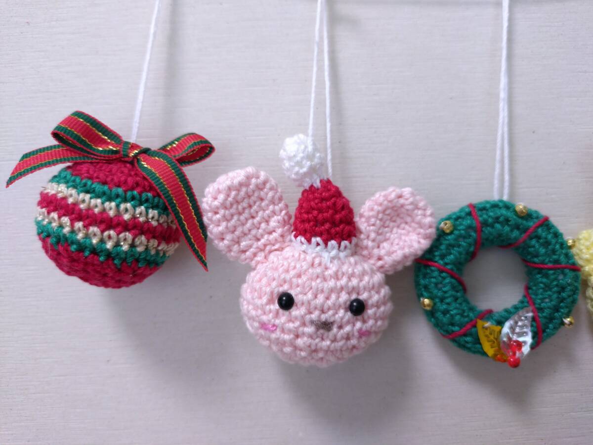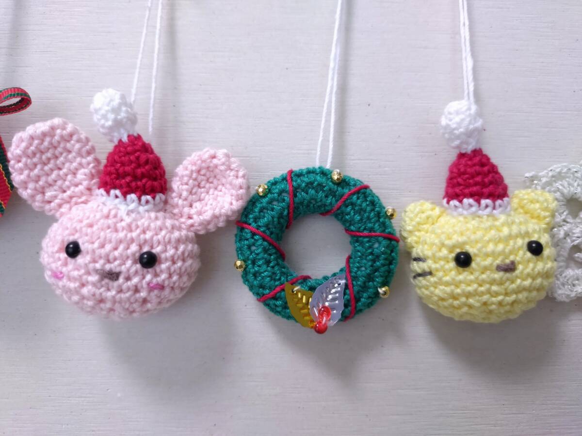 うさぎサンタさん、ねこサンタさん、クリスマスリース、ボール、雪の結晶風の5個です。