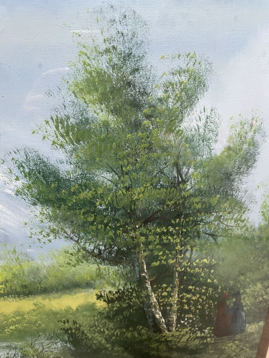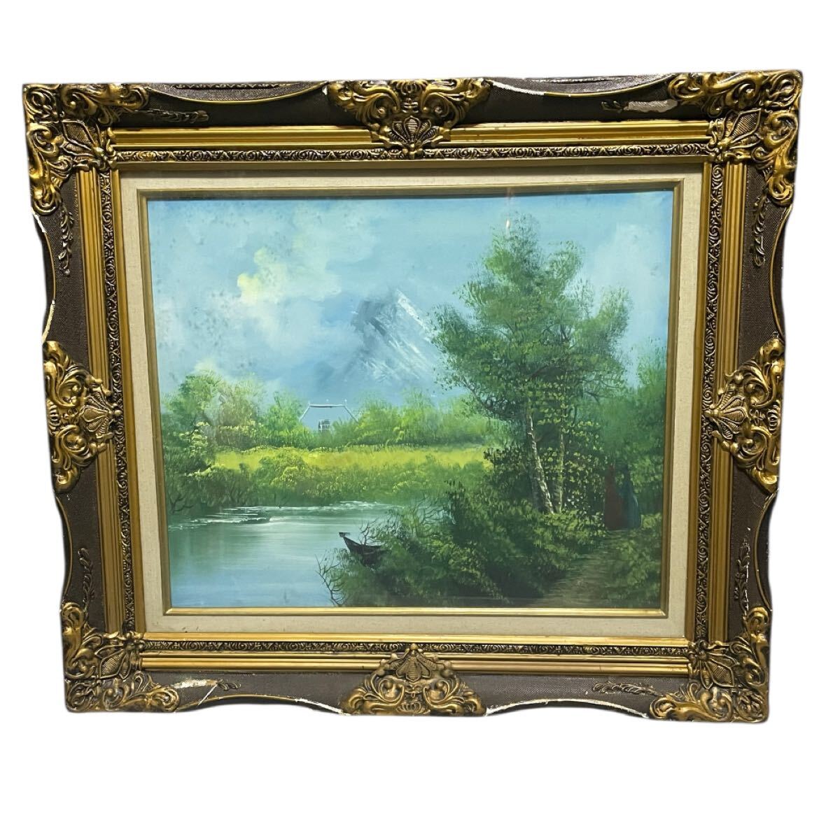 50年以上経過したアンティーク品のため、絵の具の表面、特に空の部分に経年による変色やシミが見られます。これは古い油絵特有の「味わい」としてご理解ください。額縁にも小傷がございます。
