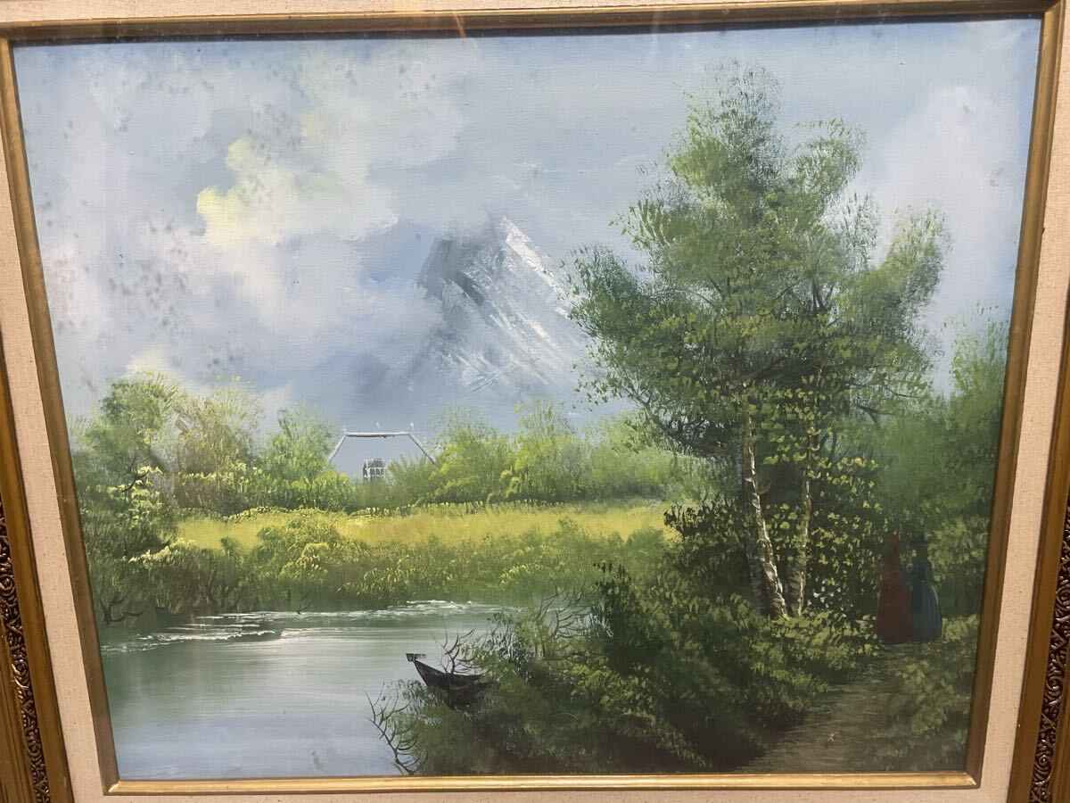 モチーフ: 雪山を遠景に望む、水辺の穏やかな風景を描いたロマンチックな構図です。重厚な額縁と相まって、お部屋に格調高い雰囲気をもたらします。