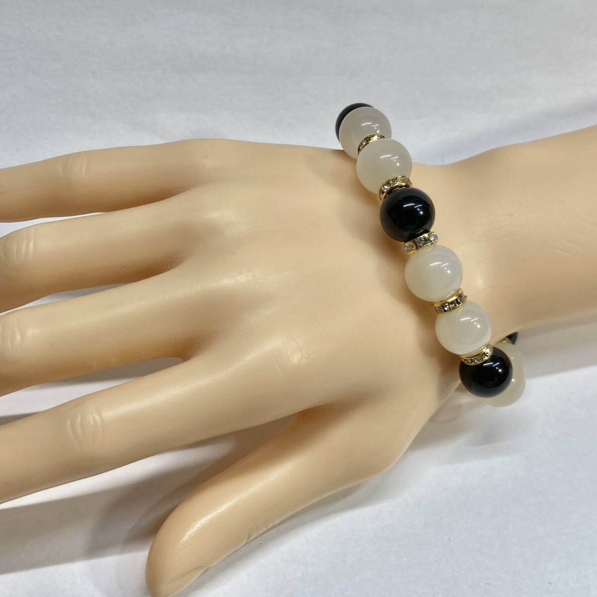こちらは、12mm玉のムーンストーンとオニキスを組み合わせたパワーストーンブレスレットです。間にはロンデルを挟み高級感あるデザインに仕上げております。石大きさは12mm玉を使用して内径約18cmです。気になる方は是非この機会にどうぞ。