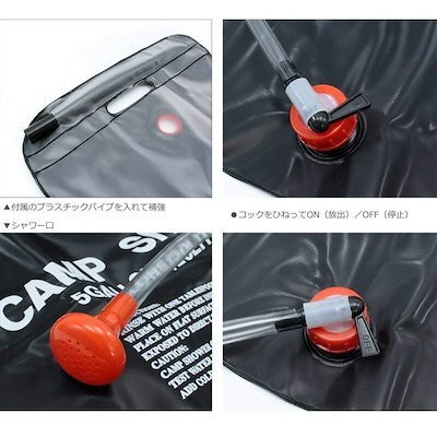 【ソーラーシャワー】電源がない場所でも、黒い本体に太陽熱が吸収し、お湯あるいはぬるま湯になりとっても便利なアイテムです。車や木などつるしてシャワーとして利用可能。