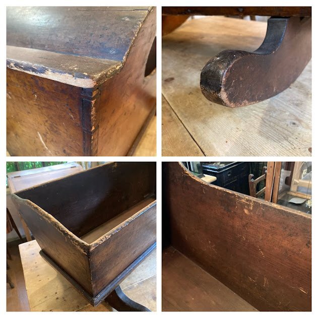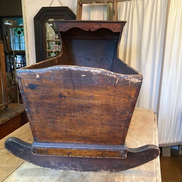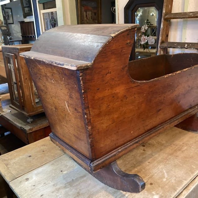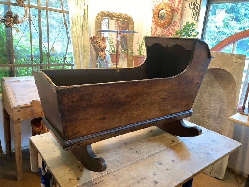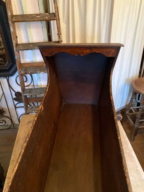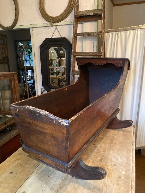 数多くの赤ちゃんやお人形に寄り添ってきたオールドパインのベビーベッド。全体的に丸みを帯びた造りは、眠る子供達が怪我をしないようにと配慮されているそう、優しい世界観にほっと癒されますね。イギリス製。推定1900年代とのこと。思っているよりも大きなサイズですので、メジャーなどでサイズをご確認ください。お人形は80㎝ぐらいなら、ゆっくり眠らせることができます。大切なお人形や、ペット専用ベッド、お花をやグリーンを飾っても素敵な空間が演出出来そうです。ひと味違う店舗ディスプレイ雑貨や撮影小物などをお探しの方におすすめ。福岡市南区の店舗にてお渡しもできますのでお気軽にどうぞ!