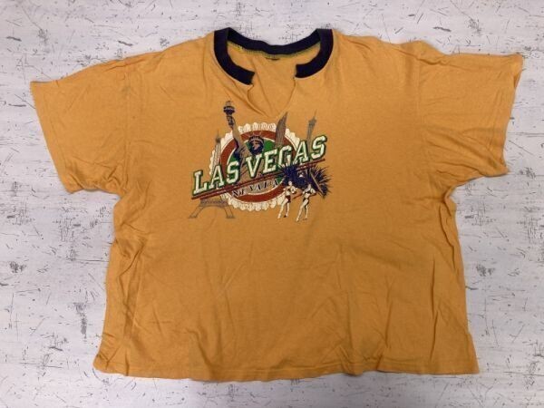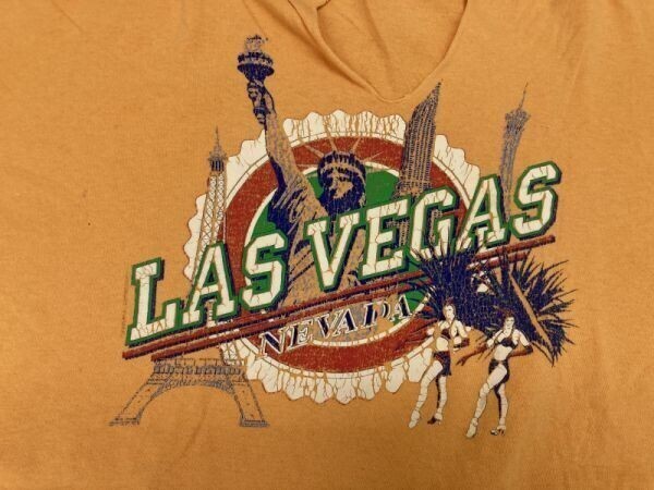 LAS VEGAS NEVADA ラスベガス ネバダ州 スーベニア お土産 リンガー トリム 首元カットオフ 半袖Tシャツ カットソー レディース オレンジ です。