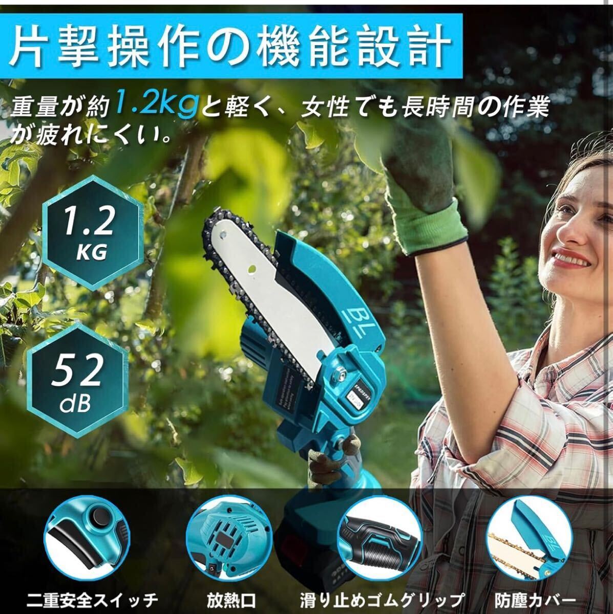 【8インチ チェーンソー &軽量静音チェーンソー】 【高速切断】8m/sの業界トップクラスチェーン速度で、直径20cmの丸太を6秒で瞬断!→ 薪割り作業時間を従来比1/3に短縮さらに、高温焼入れ処理を施したソーチェーンとガイドバーは、高硬度・高耐摩耗性・耐食性を兼ね備え、切れ味が長持ちし破損しにくい耐久設計です。 1.2kgの超軽量ボディで女性でも片手操作可能 住宅街でも安心の52dB超低騒音設計,ブラシレスモーター採用で従来比-40%の静音性能.