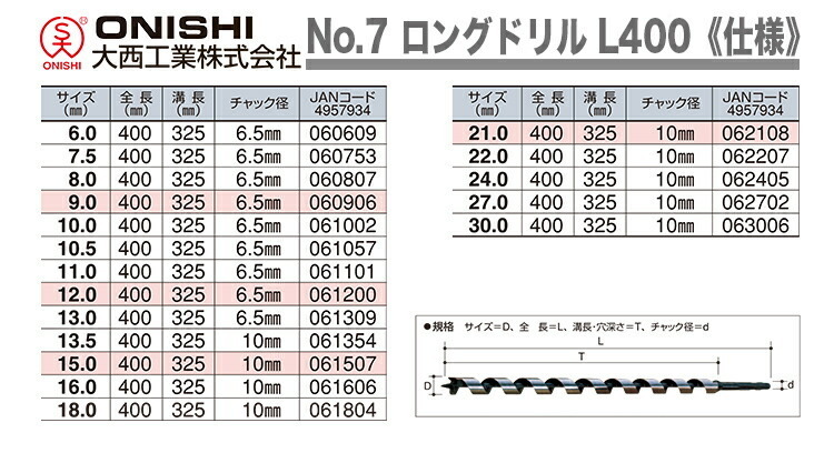 ONISH/大西工業 No.7 ロングドリル 全長L400 8mm