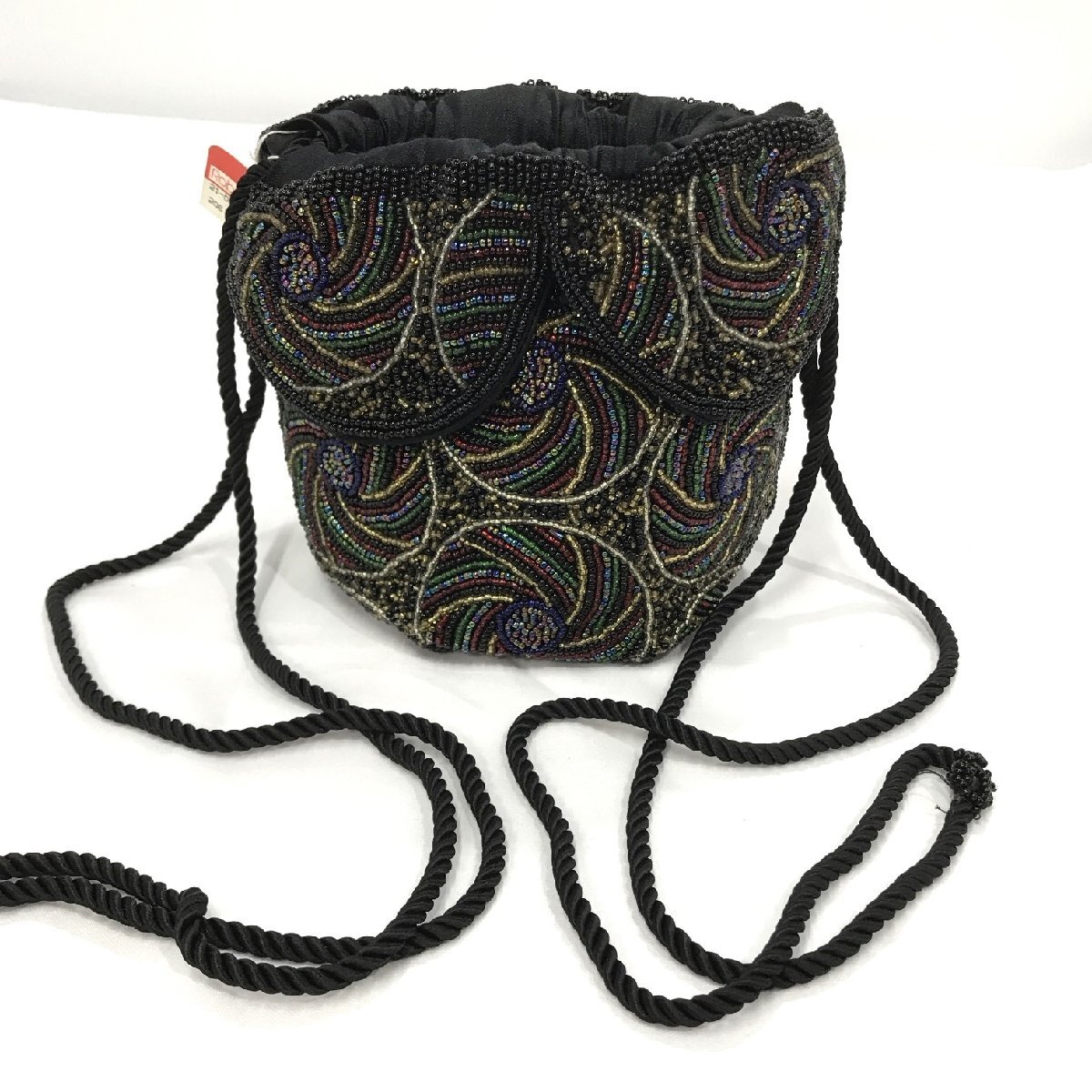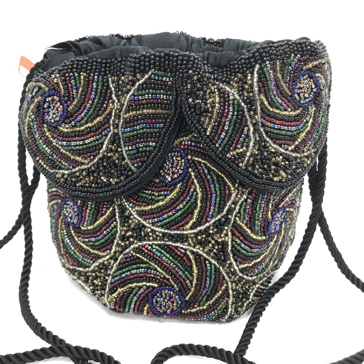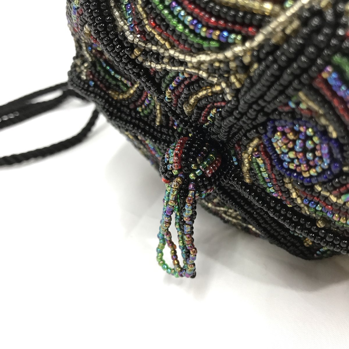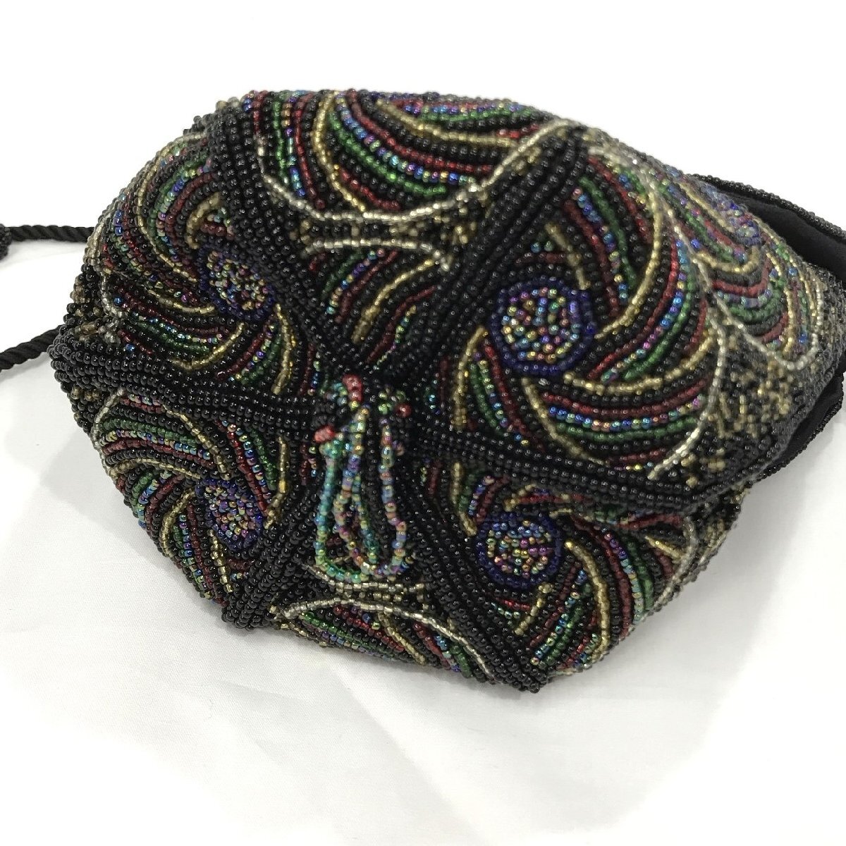 ビーズバッグ 総ビーズ 丸底 巾着バッグ 黒地 マルチカラー 刺繍 幅最大20センチ 約330g レディース ファッション小物 保管品【道楽札幌】