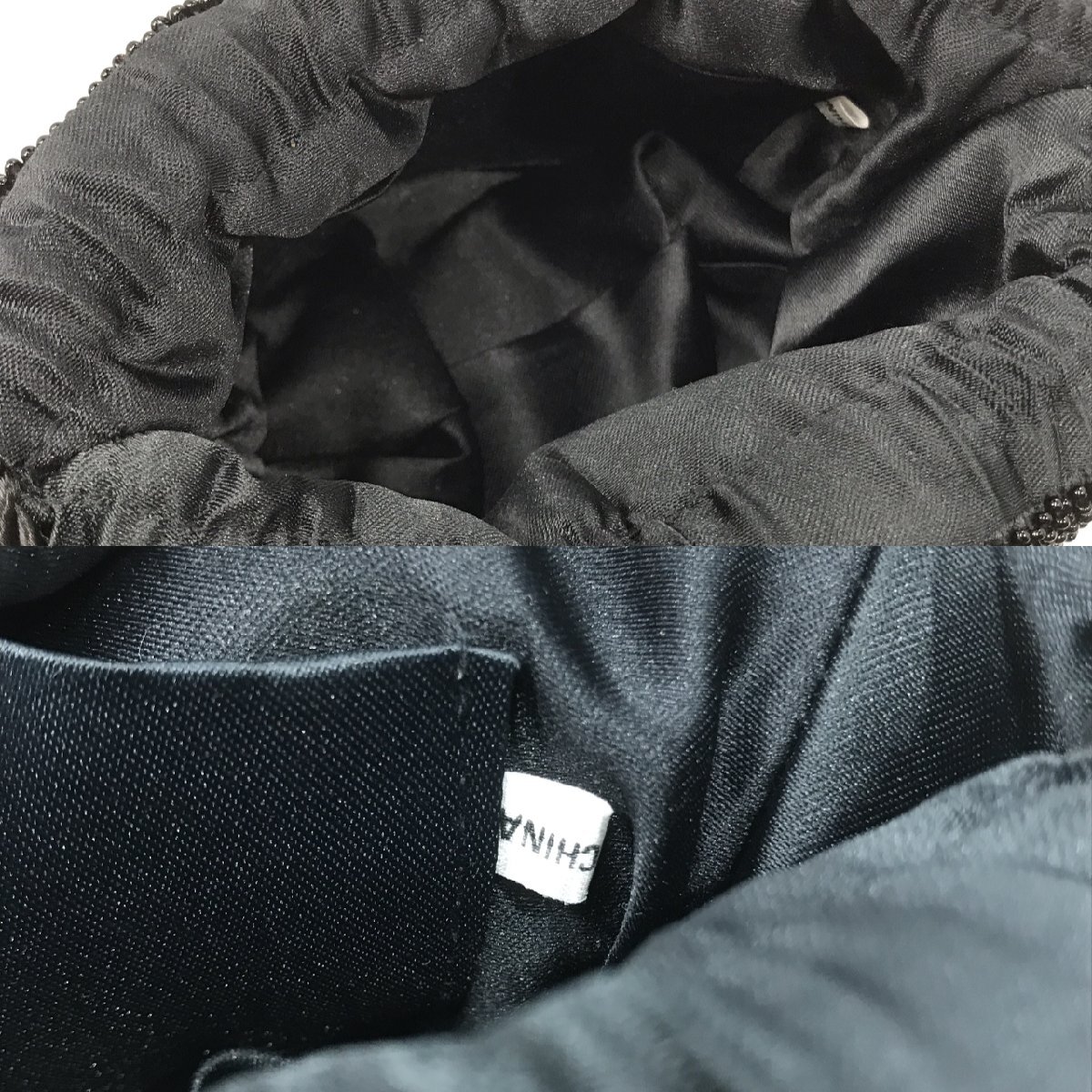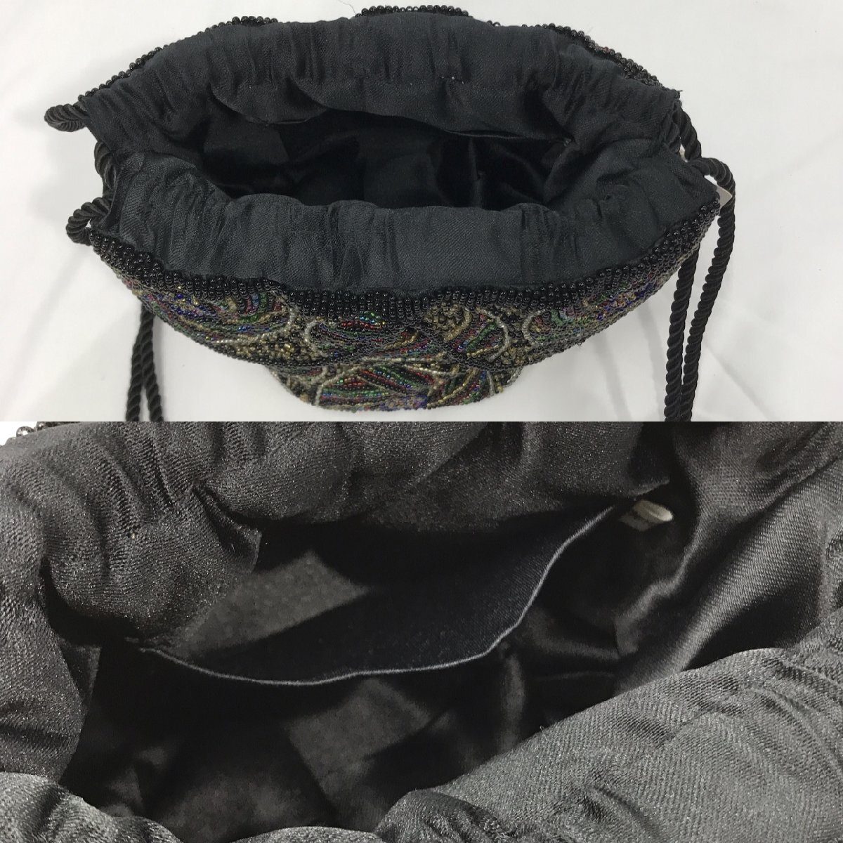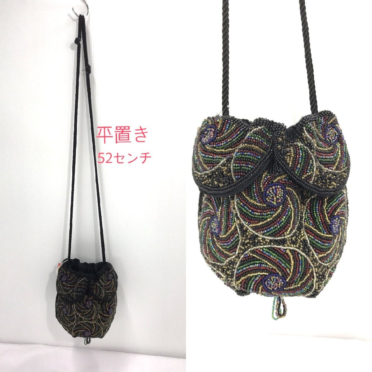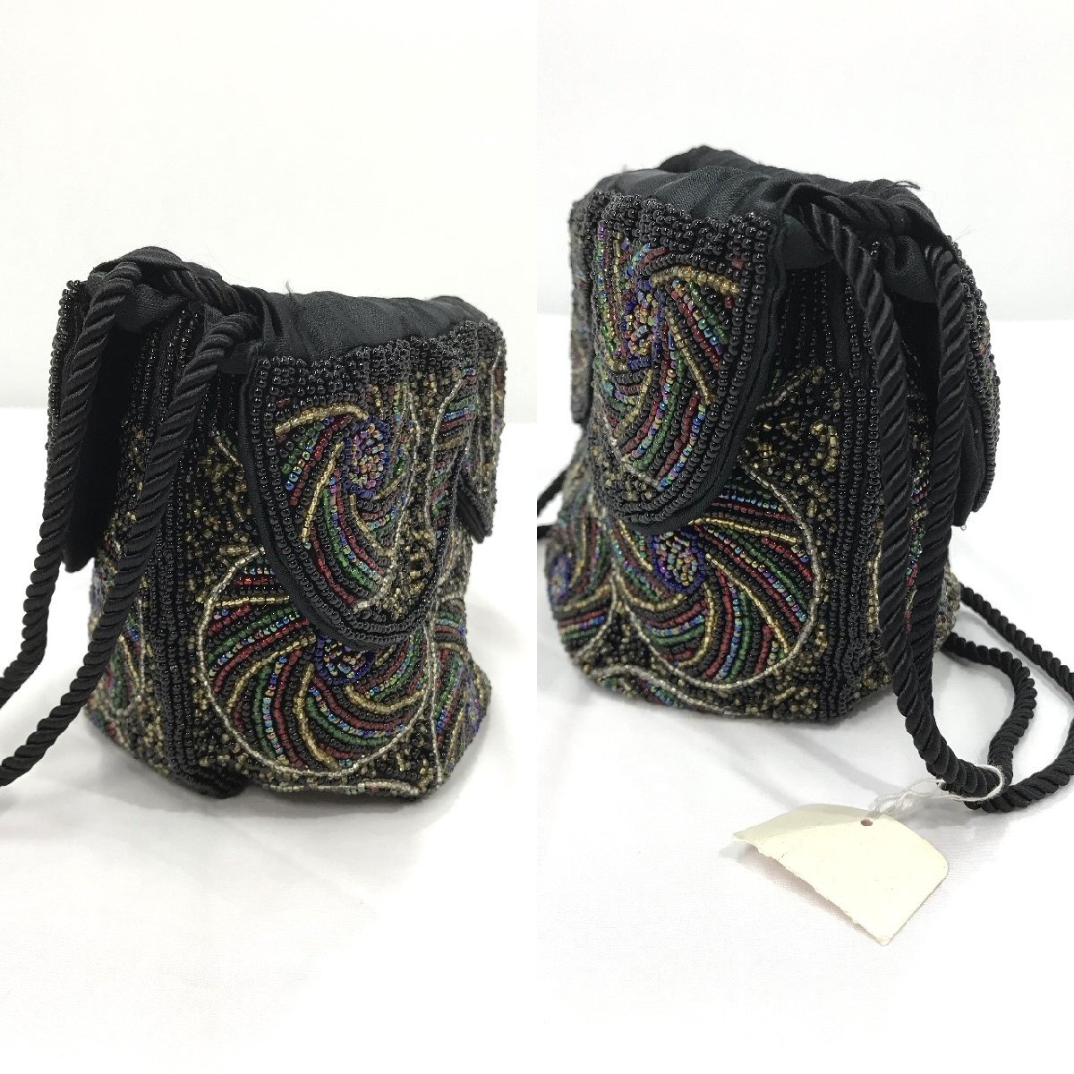 ビーズバッグ 総ビーズ 丸底 巾着バッグ 黒地 マルチカラー 刺繍 幅最大20センチ 約330g レディース ファッション小物 保管品【道楽札幌】