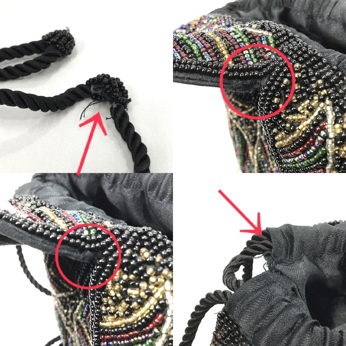 持ち手の紐のビーズの飾りにほつれ、他、数ヶ所表地に傷みがあります。