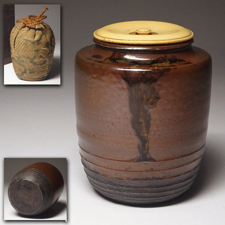 本物保証!         江戸時代前期から中期頃に焼成された瀬戸焼の広口茶入です。       胴に大胆な轆轤目を残した広口の端正な器体に古瀬戸釉の施釉がされた一作。   胴下部から畳付きにかけては土見せになっております。       蓋添え。   時代緞子仕服、時代箱付。(それぞれに経年傷みあり)         古陶故の口縁の共直し痕等は見られますが、総じて目立つような傷みは無くとても良好な状態といえます。          正真正銘本物保証!