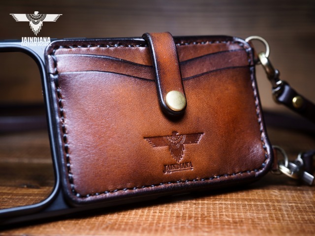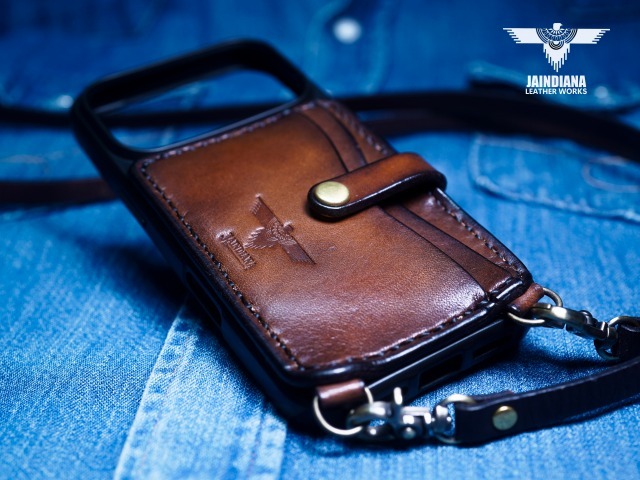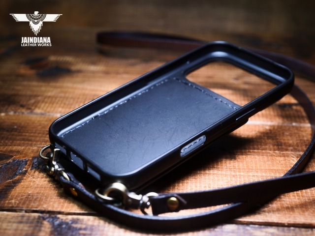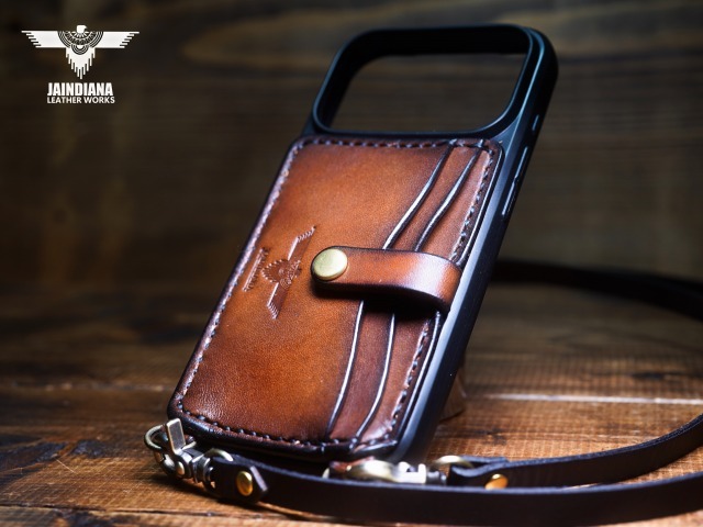 | iPhone17Proケース 手縫い サドルレザー ビンテージ染めブラウン ネックストラップ付き(iPhone17Air仕様での製作も可) | ||||