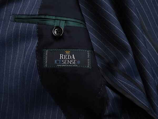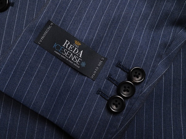 水牛釦、本切羽、AMFステッチ、ラペル毛芯など、百貨店向けならではの上級仕立てで仕上げられております。ファブリックはイタリア随一の伝統と最大級の規模を誇るREDA社の生地を使用。REDA ICESENSEは、ゼニアのクールエフェクトと同じ原理から、スーツ地の表面温度を下げる効果のある春夏用素材です。赤外線の吸収を抑え、反射を促進することで、スーツ生地の表面温度を8度も下げることで、スーツ内の温度上昇を下げ体感温度はマイナス10度以上も変わります。ポーラー調のシャリ感のある生地感になります。