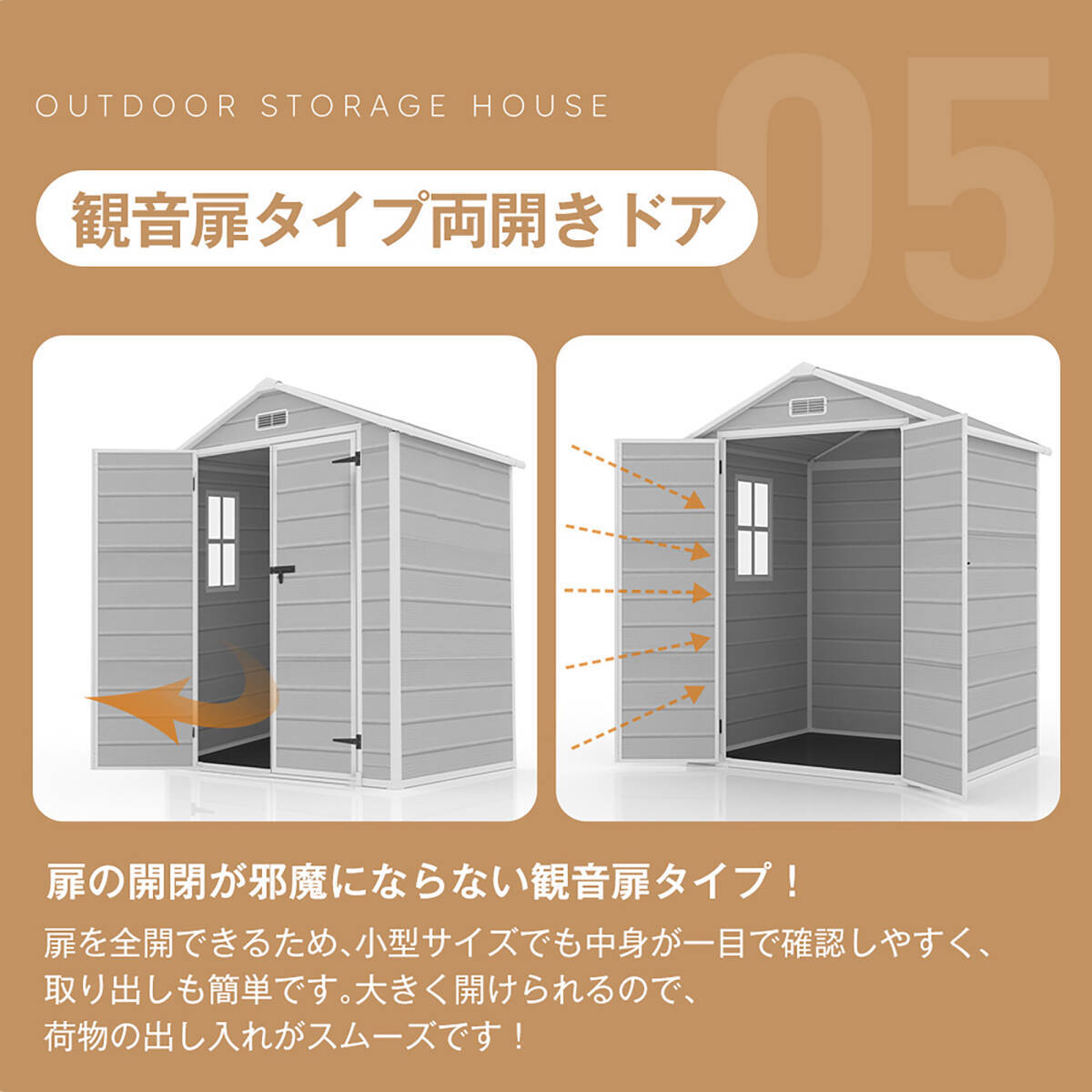 【床板付き型】1.組み立て後そのまま設置可能→ 面倒な「土台作り/板カット」作業ゼロ2.高耐久樹脂床板に直置き可能→ 布団/衣類など直接収納OK【室内を明るく保つ天窓!】高品質のアクリル材を使用しています。光の透過率が優れています。耐衝撃性に優れており、割れにくいため安全性が高いです。【大容量でしっかり収納】コンパクトサイズで 3500 Lの容量のモノを収納可能。ガーデン用具や季節ごとのアイテムなど、室内で置きにくいものもスッキリ片付けられます。【木目調立体プリント】木目調デザインは、暖かみあふれる自然素材感が魅力的です。和風の静かな庭や、洋風のエレガントな庭にも見事に調和し、高級感を演出します 。【観音扉タイプ両開きドア】扉の開閉が邪魔にならない観音扉タイプ!扉を全開できるため、小型サイズでも中身が一目で確認しやすく、取り出しも簡単です。大きく開けられるので、荷物の出し入れがスムーズです!【耐久×コンパクト→PP樹脂製】・紫外線カット加工(UV耐性)→ 褪色・劣化防止・-30℃~70℃耐温度 → 北海道から沖縄まで対応・防カビ・防錆仕様 → 梅雨時期も安心・環境配慮素材【傾斜屋根+排水勾配付き】防水設計|湿気から工具を守る頑丈で耐久性があり、変形しにくい、悪天候から内部の物品を保護します【安心の耐荷重】家族の思い出も、大切な道具も、全部守れる収納力【施錠可能】お客様自身で施錠できるので、中の物品を安全に保管できます【樹脂ドア専用設計の金属丁番】・樹脂と金属の結合部を強化、長期間の使用にも耐える・ブラックメタルカラーの素材コントラストで、シンプルかつモダンな見た目を実現