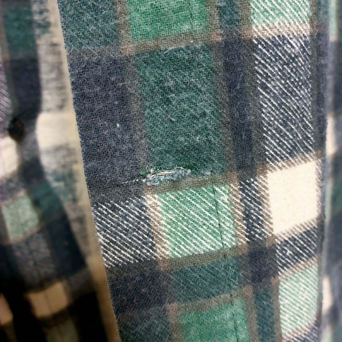 ペンキ跡、ボタンホールほつれ、5ミリほどのダメージがあります。
