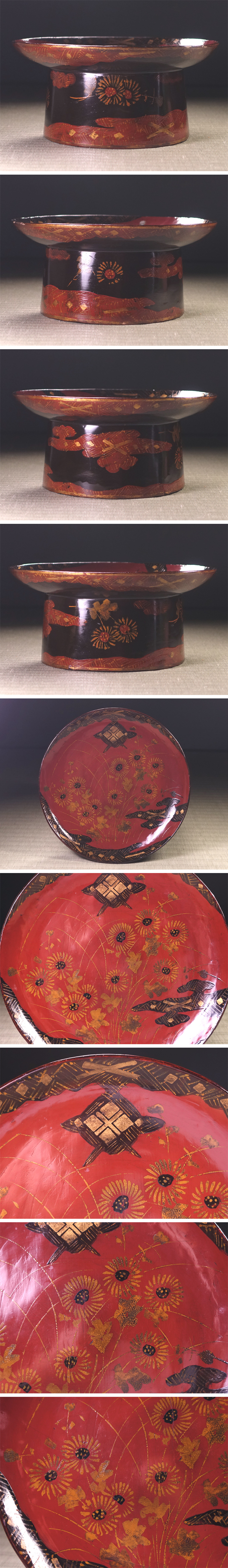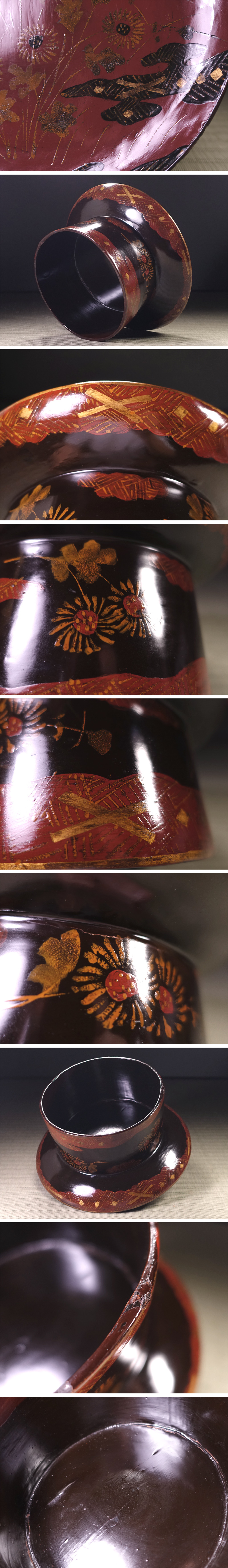 【状態】    古い漆器ですのでスレ汚れや小傷、一部加筆修繕等の経年疵も見られますが、目立つ大きな傷みはなく良好な状態です。