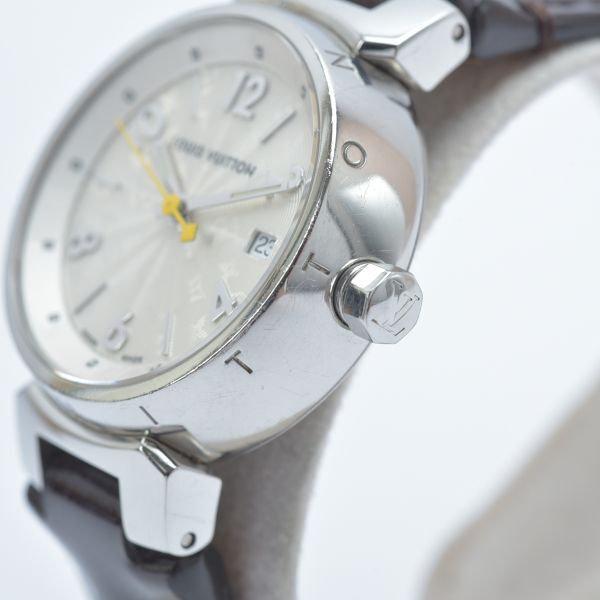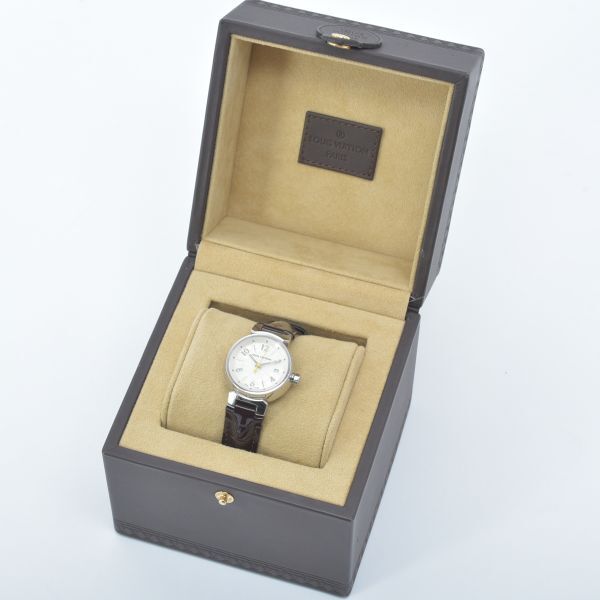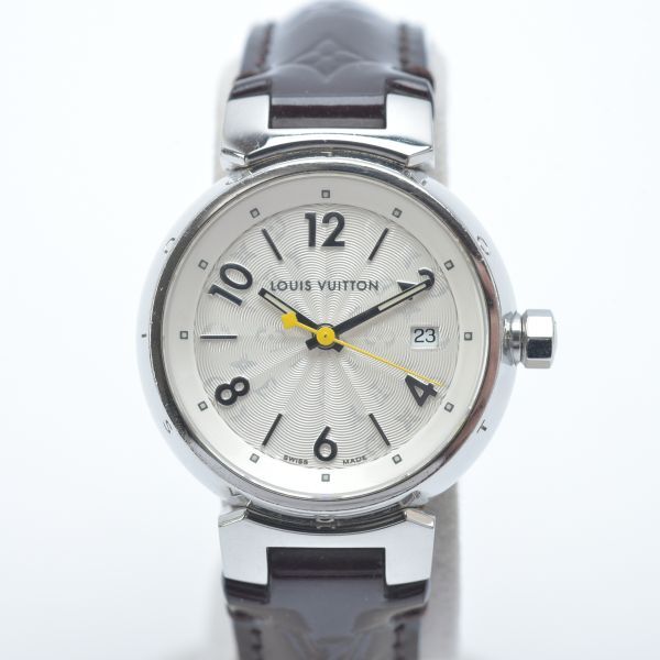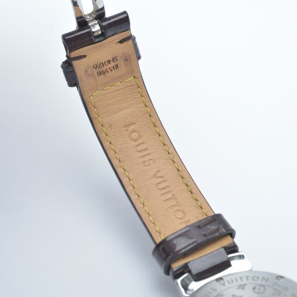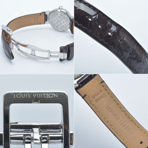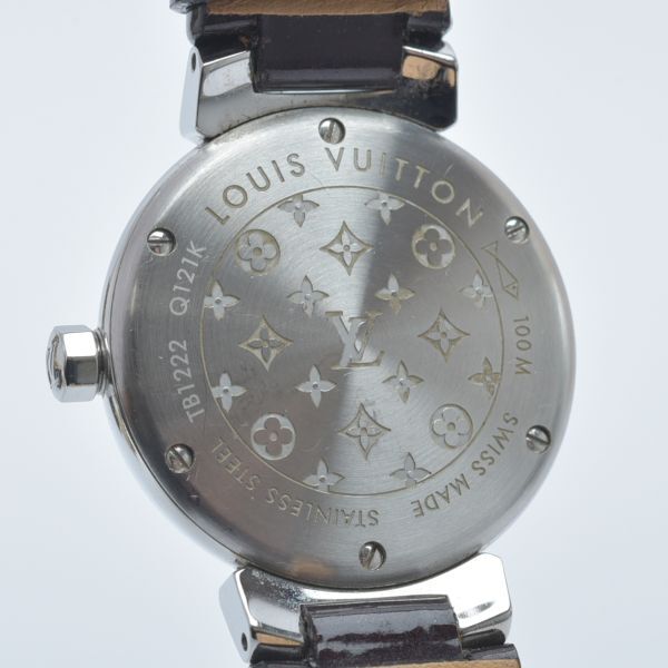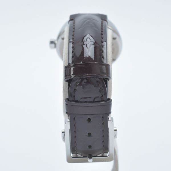 美品 ルイヴィトン タンブール 腕時計 稼働品 Q121K モノグラム ホログラム 純正ベルト エナメル ブラウン ケース付き /070703-41/e.f