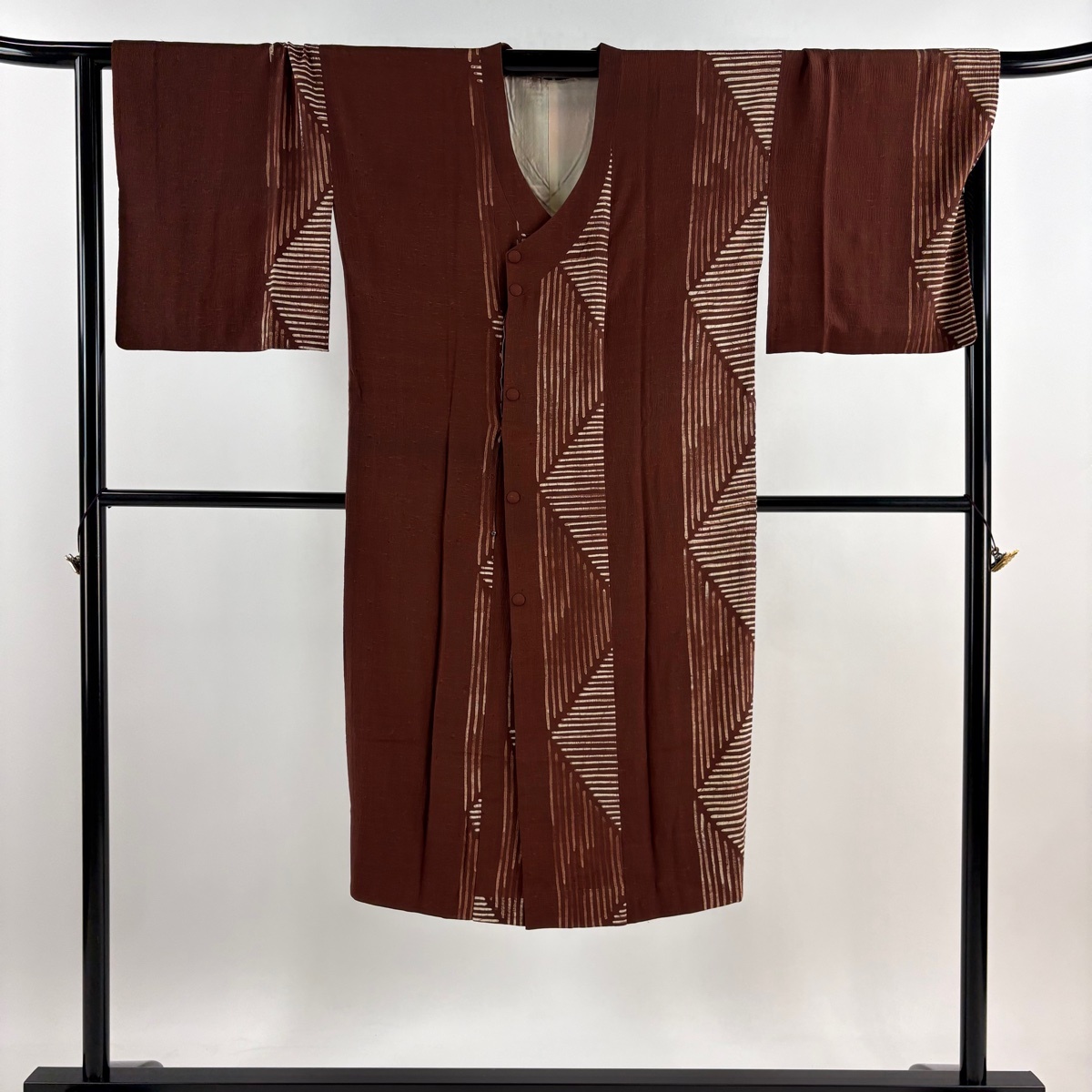 | 道行 美品 名品 紬地 和装コート 千代田衿 縞模様 幾何学模様 茶色 身丈122 裄丈67.5 L 正絹 【中古】 |