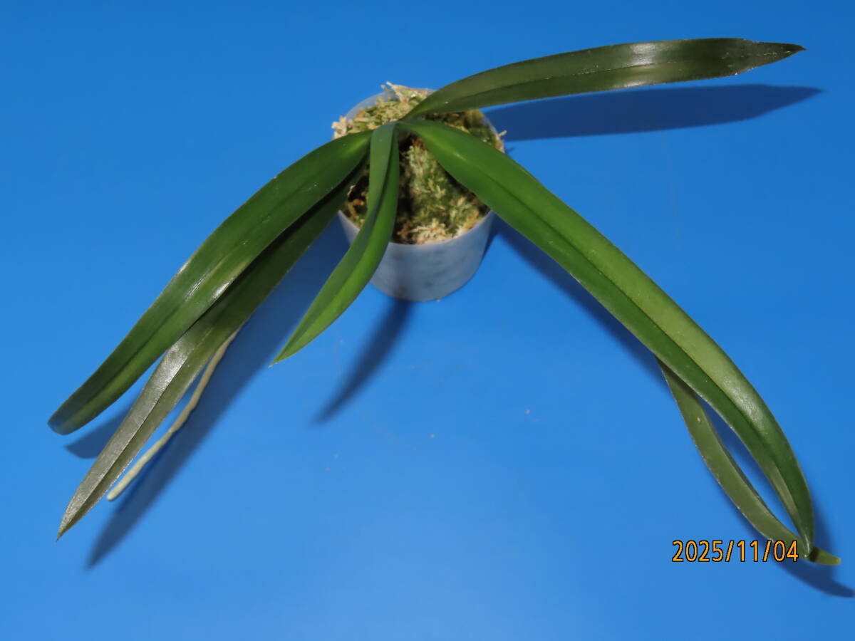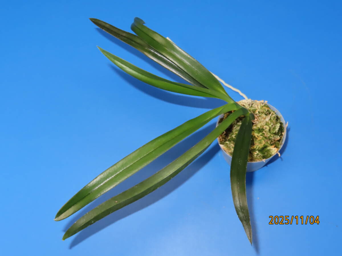 風蘭×リンコスティリスのルースネアリー系交配種は初秋咲きですが、本種は4~5月咲きです。