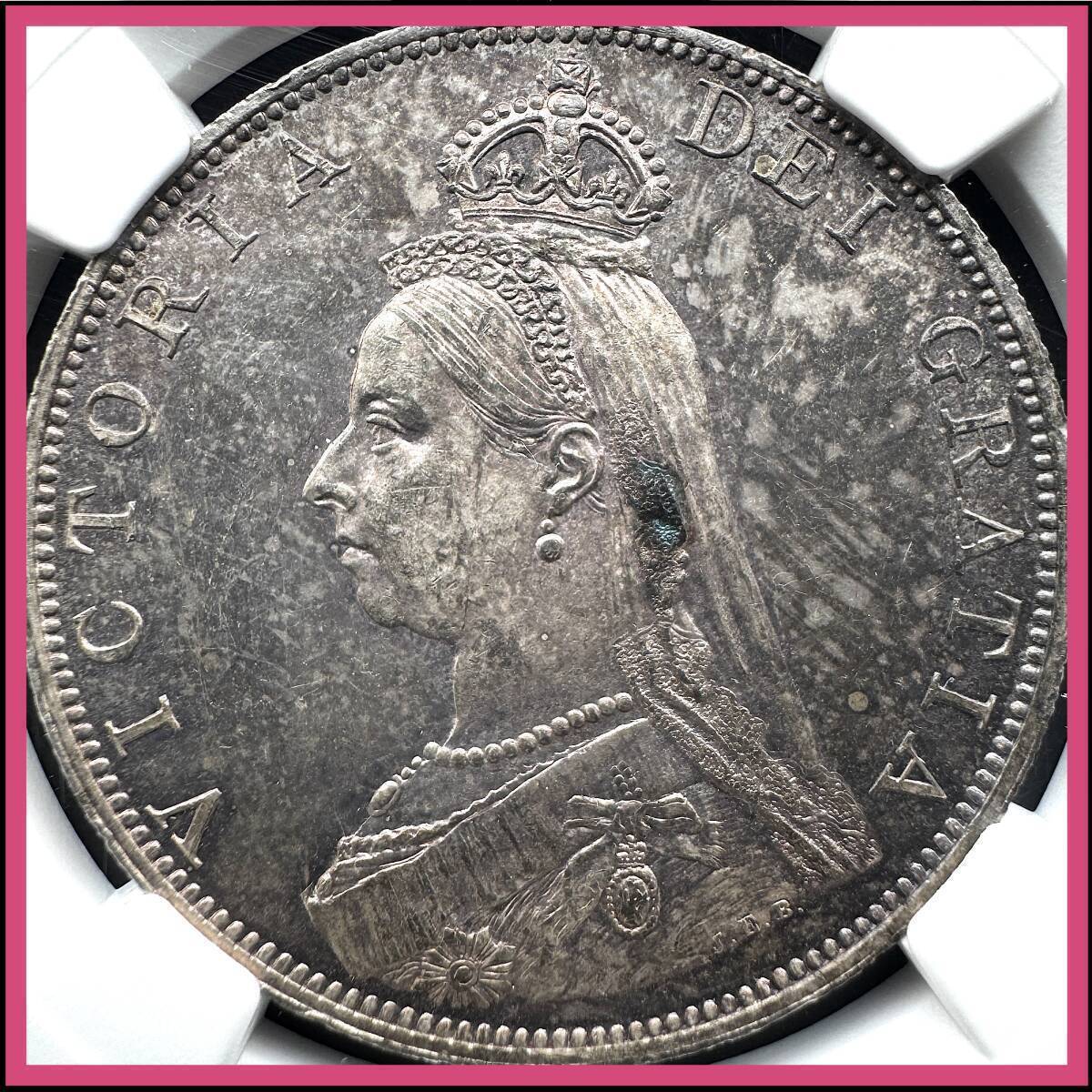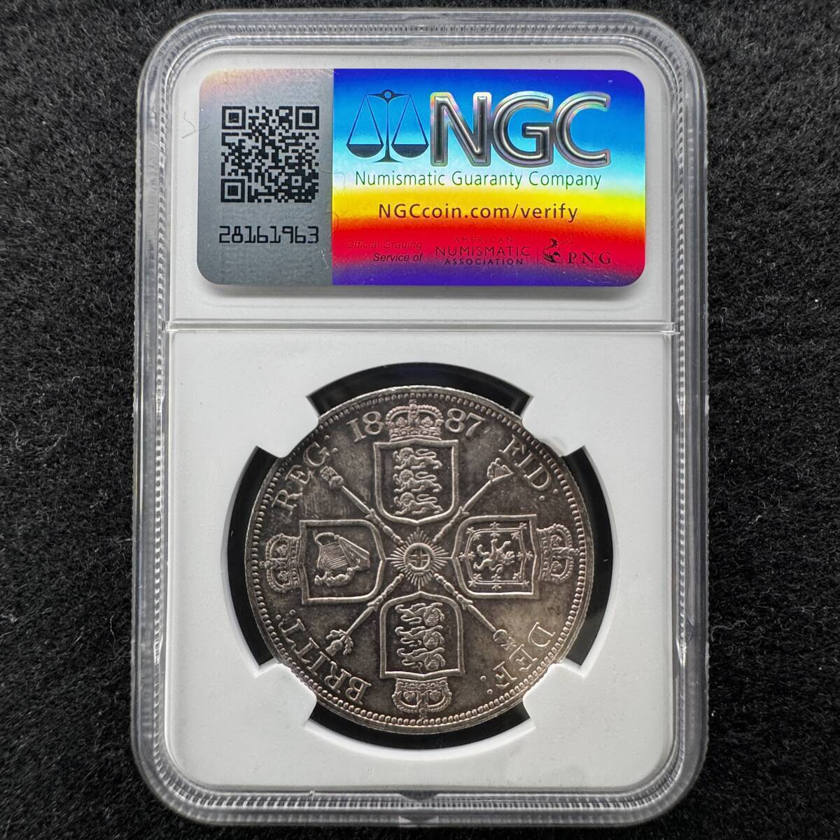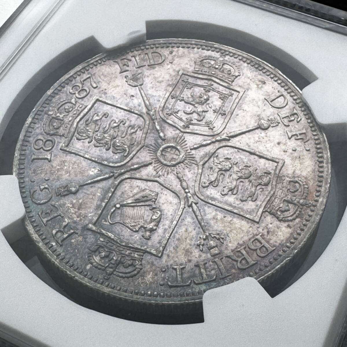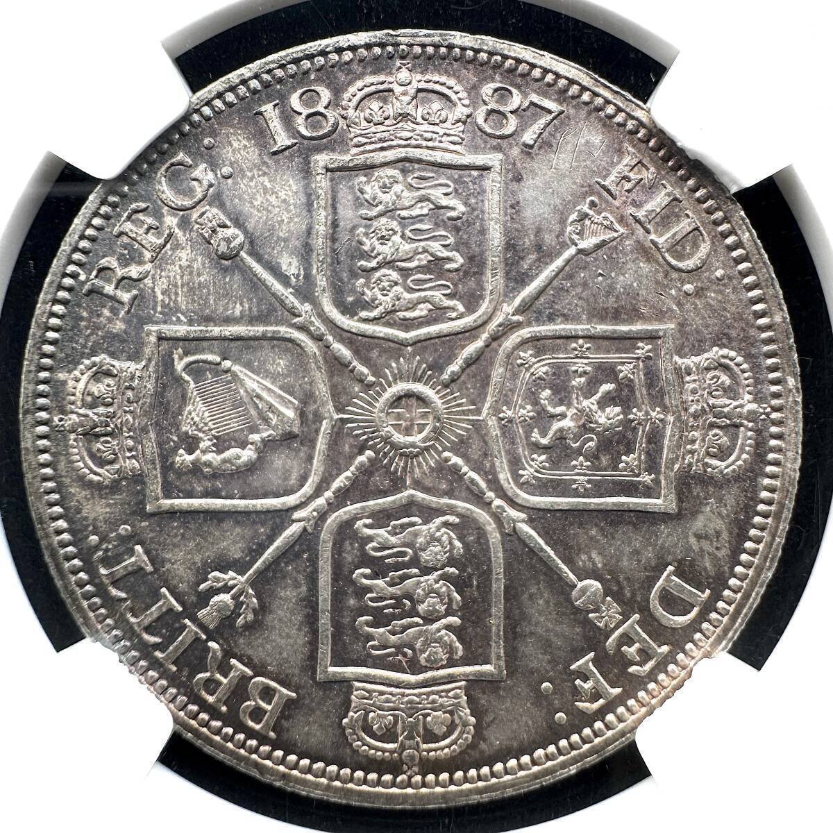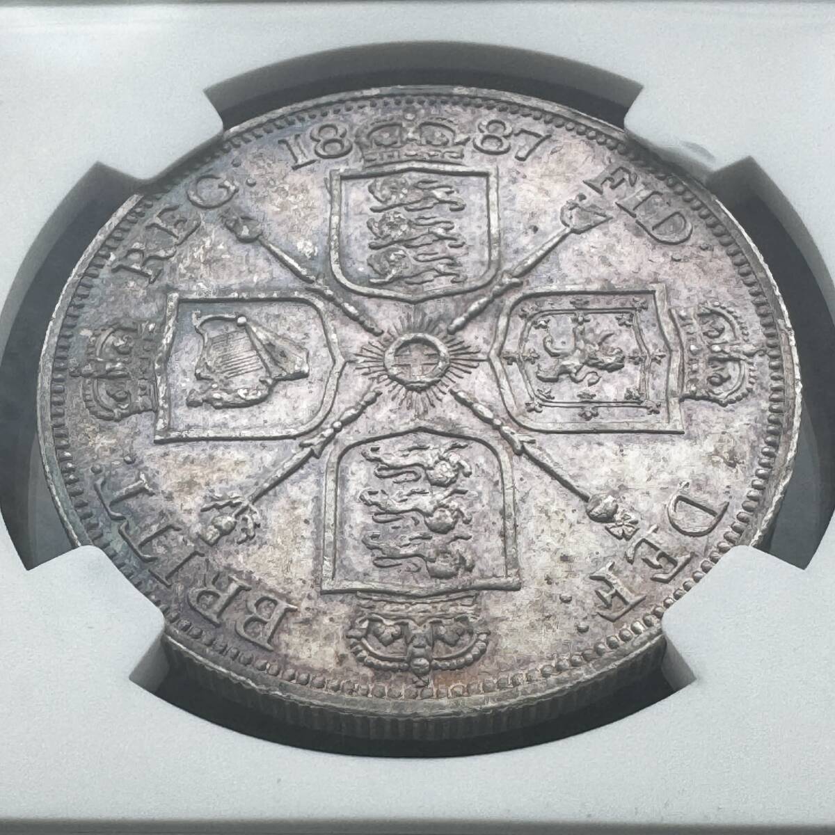 このコインは、ヴィクトリア女王の治世50周年を記念して発行された「ダブルフローリン」4シリング銀貨で、1887~1890年のわずか4年間のみ製造された、英国の歴史において最も短命な銀貨の一つです。