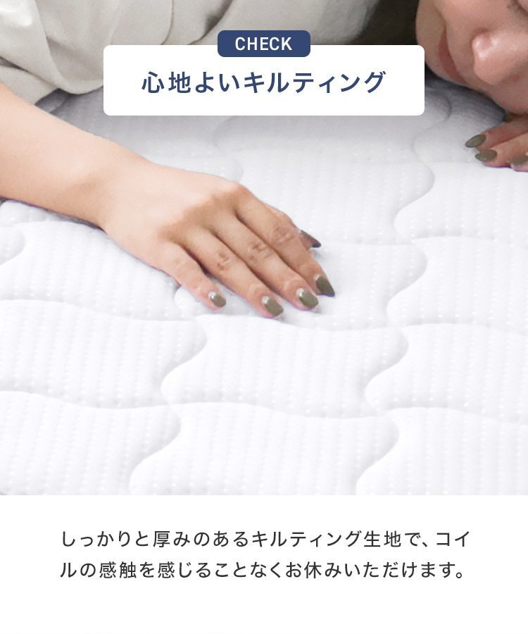 | 480個のボンネルコイル、高密度30Dのウレタン! 厚みたっぷり17cm! 多重構造で硬すぎず、やわらか過ぎない安定感とクッション性で身体をしっかり支えるマットレスです。 ボンネルコイルは通気性抜群! 身体を面で支え、体にかかる負荷を分散させるので、肩や腰の沈み込みを防ぎ、安定感のある寝心地です。 高密度30Dのウレタンを使用しているので、へたりにくく、長時間寝ている間もしっかり支えます。 三つ折りタイプなので、狭いお部屋でもコンパクトに収納でき、マットレスを立てかけて干すことができるので、湿気対策に最適です。 また、真空圧縮梱包したコンパクトな状態でお届けします。 【商品仕様】 カラー:ホワイト サイズ:(約)幅140cm×長さ195cm×厚み17cm(ダブルサイズ) コイル数:480個 線径:2.2mm 巻数:5巻 素材:ボンネルコイル、高密度ウレタン(密度30D)、ハードフェルト、パイル生地 他 |