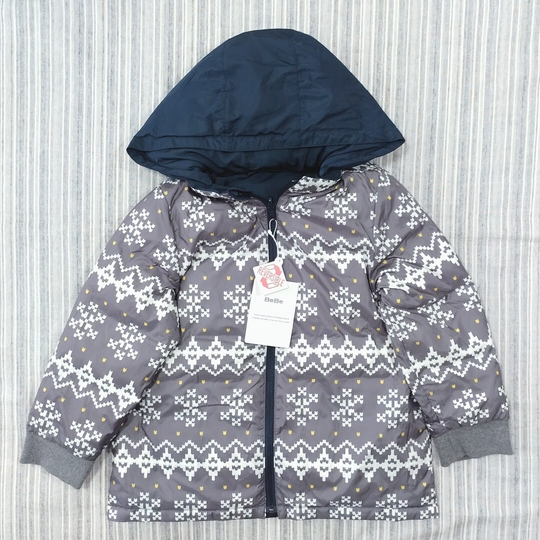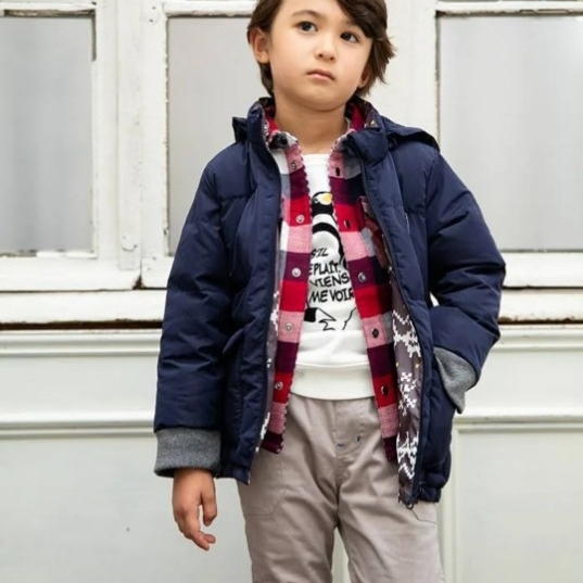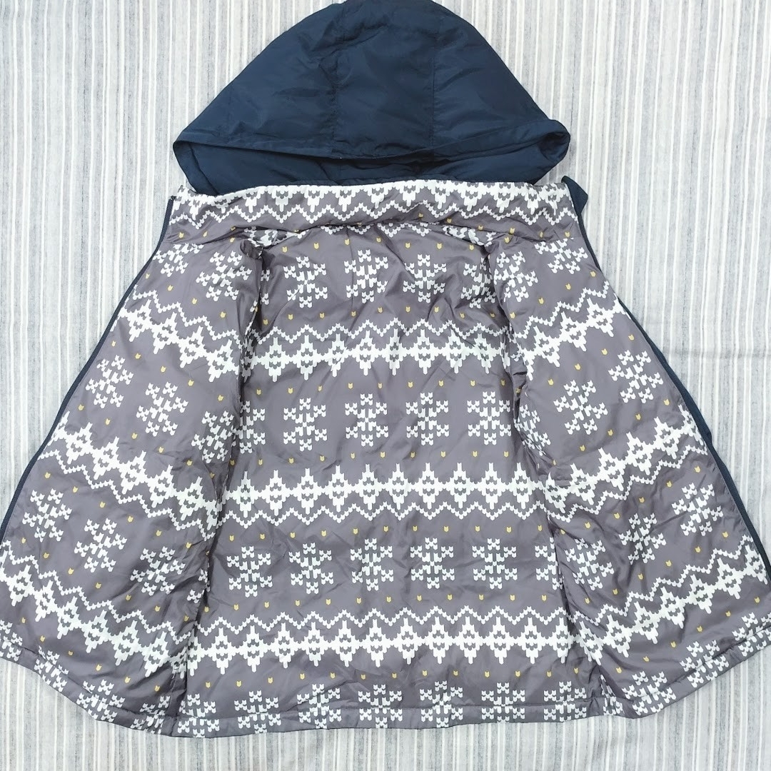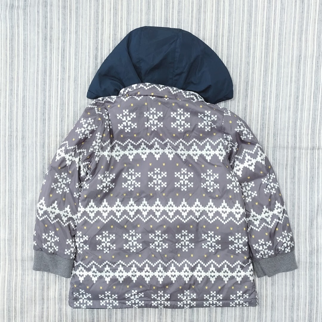 胸元のワッペンが際立つシンプルなタフタコートは、裏返すと寒い季節にピッタリな雪柄が全面にプリントされたリバーシブル仕様!表裏で全く印象の異なる着こなしをお楽しみいただけます。単調になりがちな冬のアウターは、コーディネートや気分に合わせてイメージを変えられるデザインがおススメです。フードの取り外しも可能なので通園・通学にも活躍間違いなしのアイテムです。